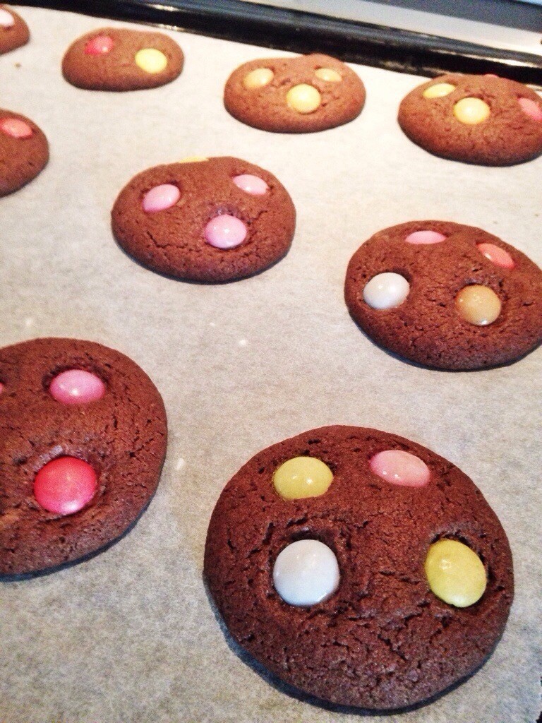 4) Låt varje kaka få ett par centimeters mellanrum så att de kan flyta ut lite. Placera ca 4-5 Non Stop-knappar på varje kaka. Grädda kakorna i ca 15 minuter i mitten av ugnen. Låt svalna på ugnsgaller.