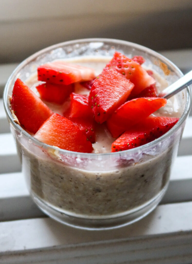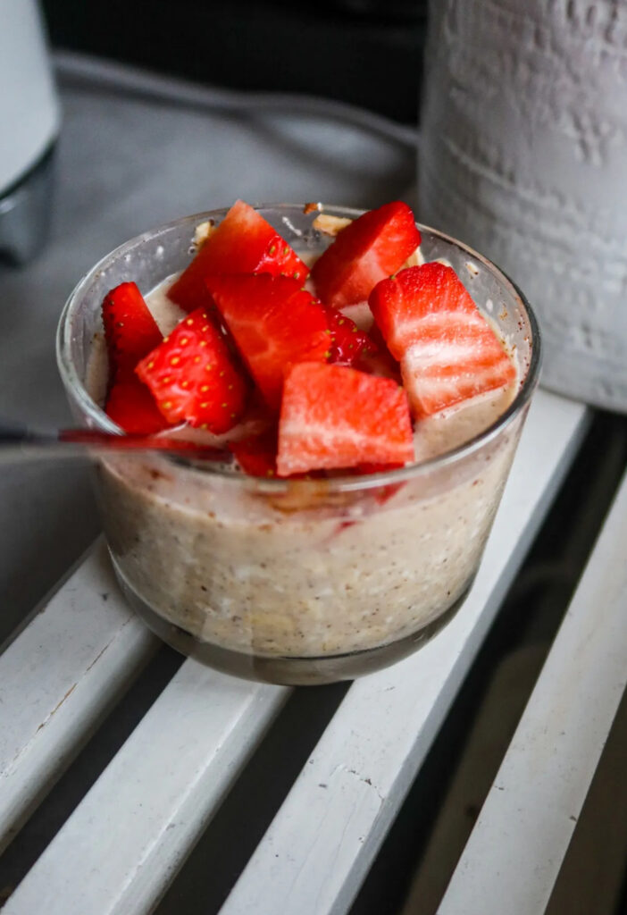 1) Blanda havregryn, vatten, salt, kardemumma, salt, kanel, mosad banan och lönnsirap i en glasburk eller liknande. Det är bra om du kan sätta lock på det i kylen. Ställ i kylen i minst 2 timmar, gärna hela natten.
