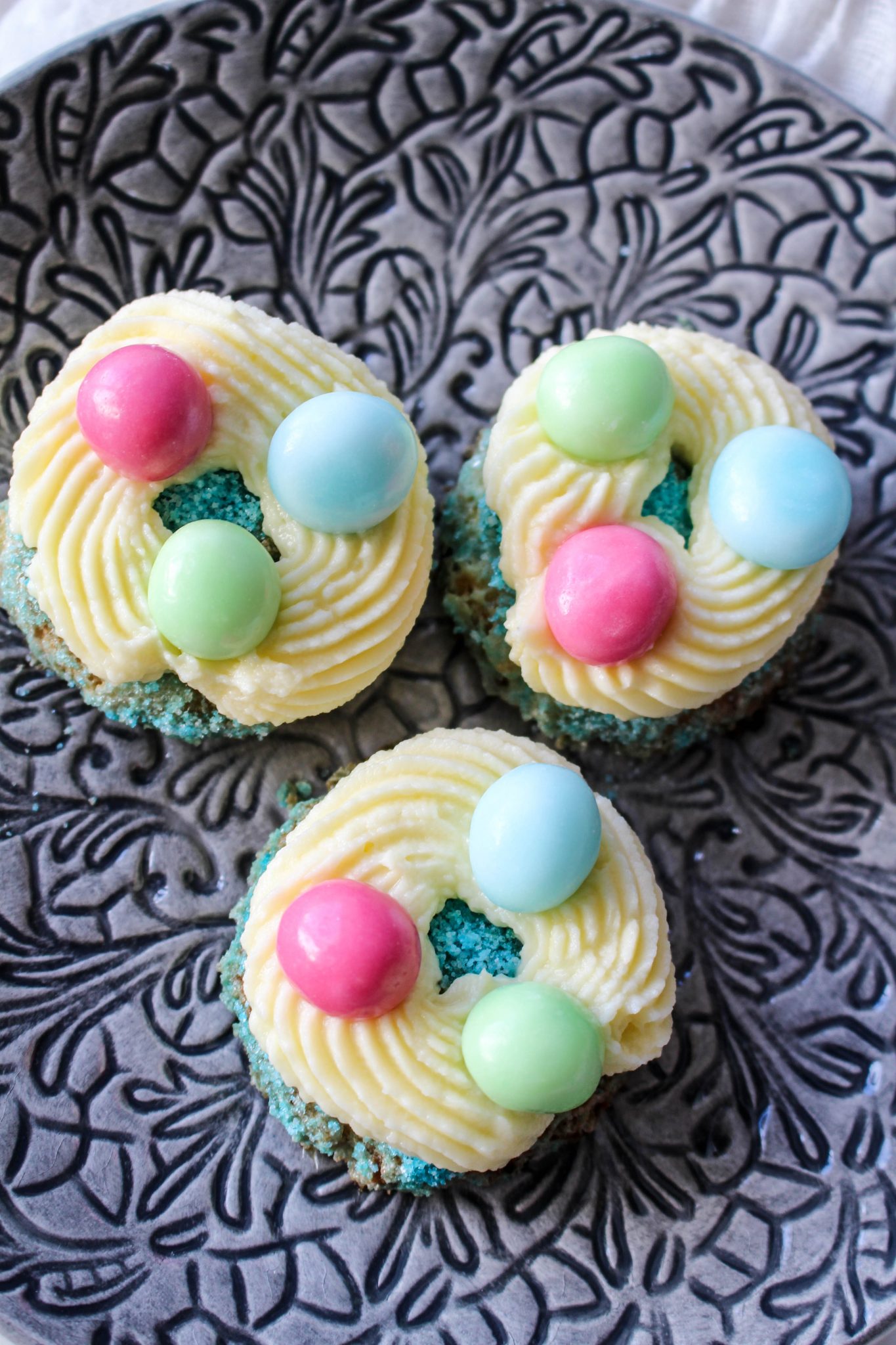 5) Spritsa frostingen på kakorna. Lägg på godisar på kakorna.