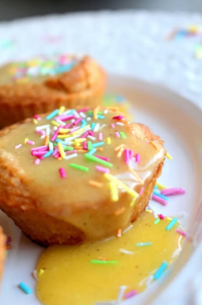 4. Dags för glasyren. Smält smöret, ta av kastrullen från värmen. Ha i florsocker och vaniljsocker. Rör om. Ha i en äggula så binder det samman glasyren. Häll på glasyr på varje muffins. Det får gärna rinna lite på sidorna, det är bara göttigt med lite sånt. Låt glasyren stelna till lite. Ha till sist på lite strössel.