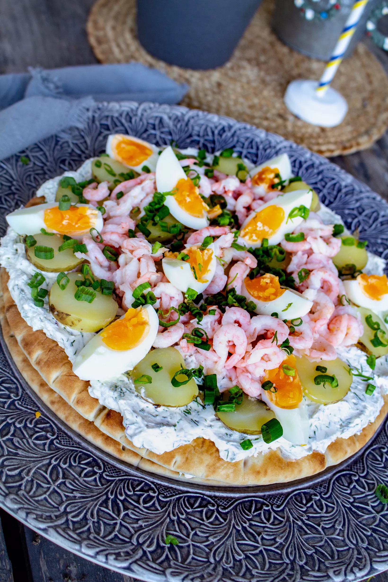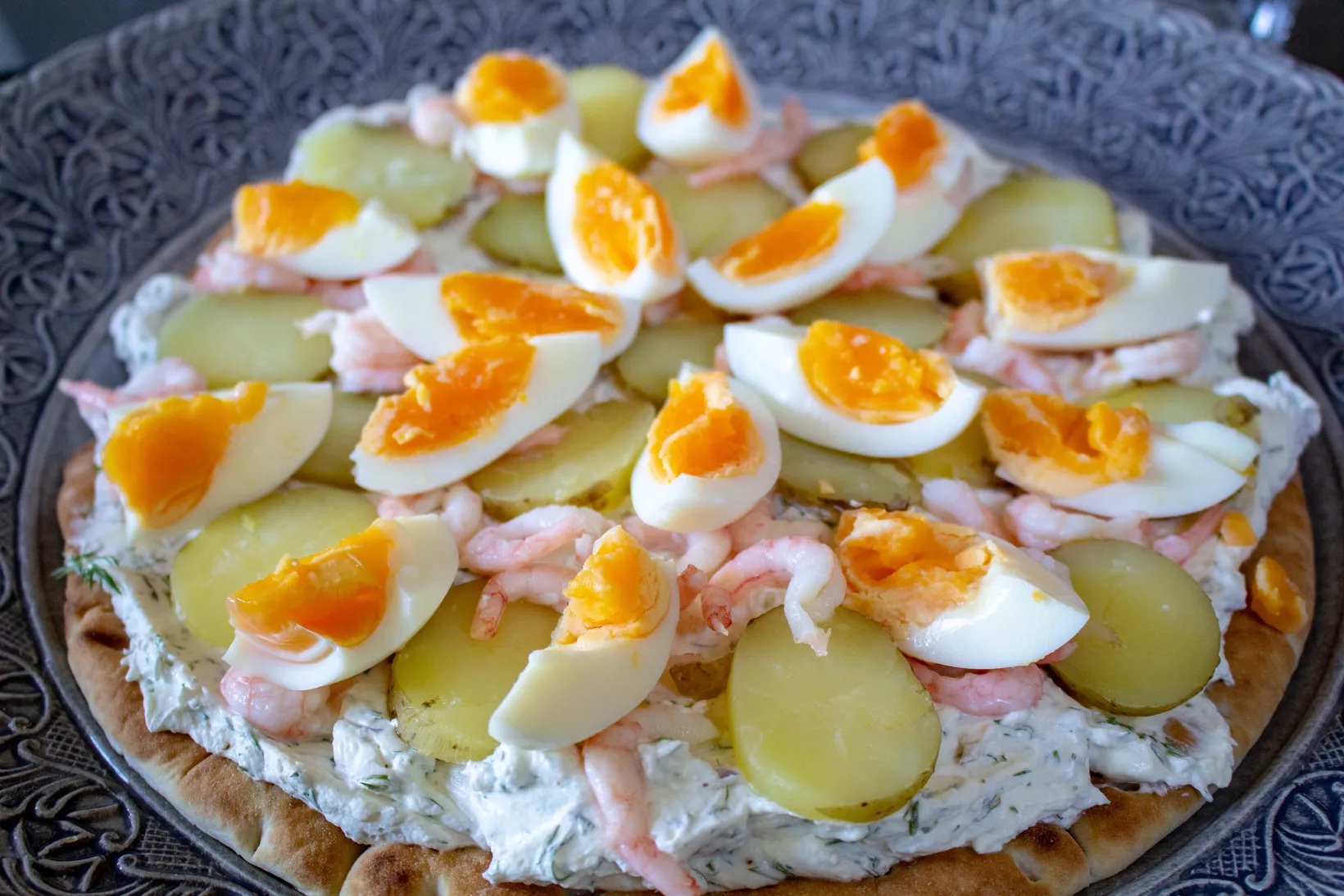 3) Lägg ut brödet på ett stort fat. Det ska vara ett stort runt bröd. Bred ut ungefär hälften av fyllningen på kakan. Skiva färskpotatis och lägg på, dela äggen i 4 klyftor och lägg på dem också. Rippla över lite räkor avslutningsvis.