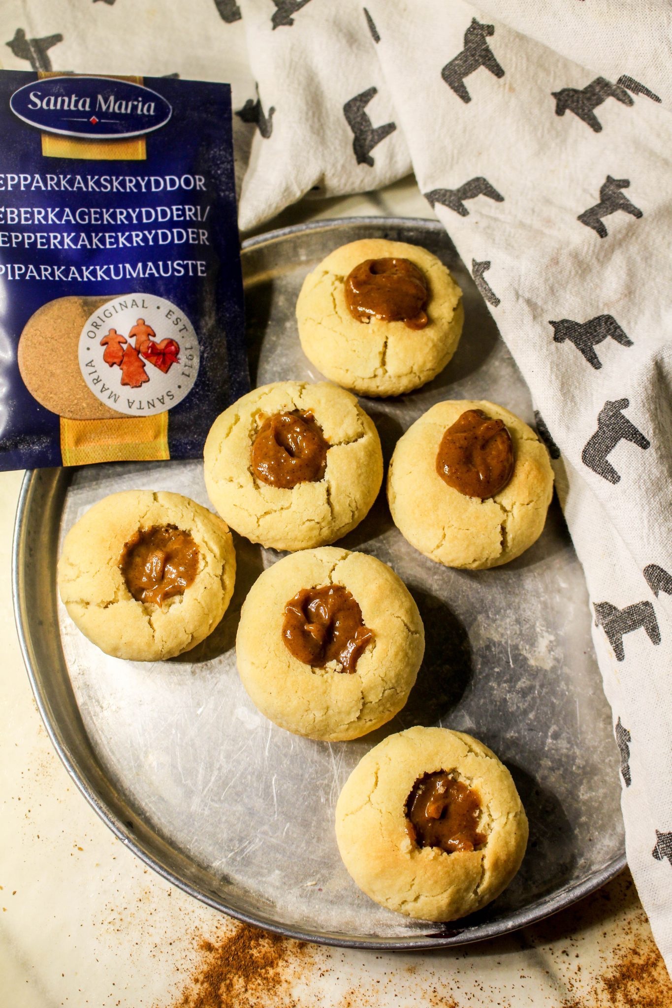 4) Gör hål i mitten av kakorna. Blanda karamelliserad mjölk och pepparkakskrydda. Klicka i blandningen i kakorna. Ät & njut!