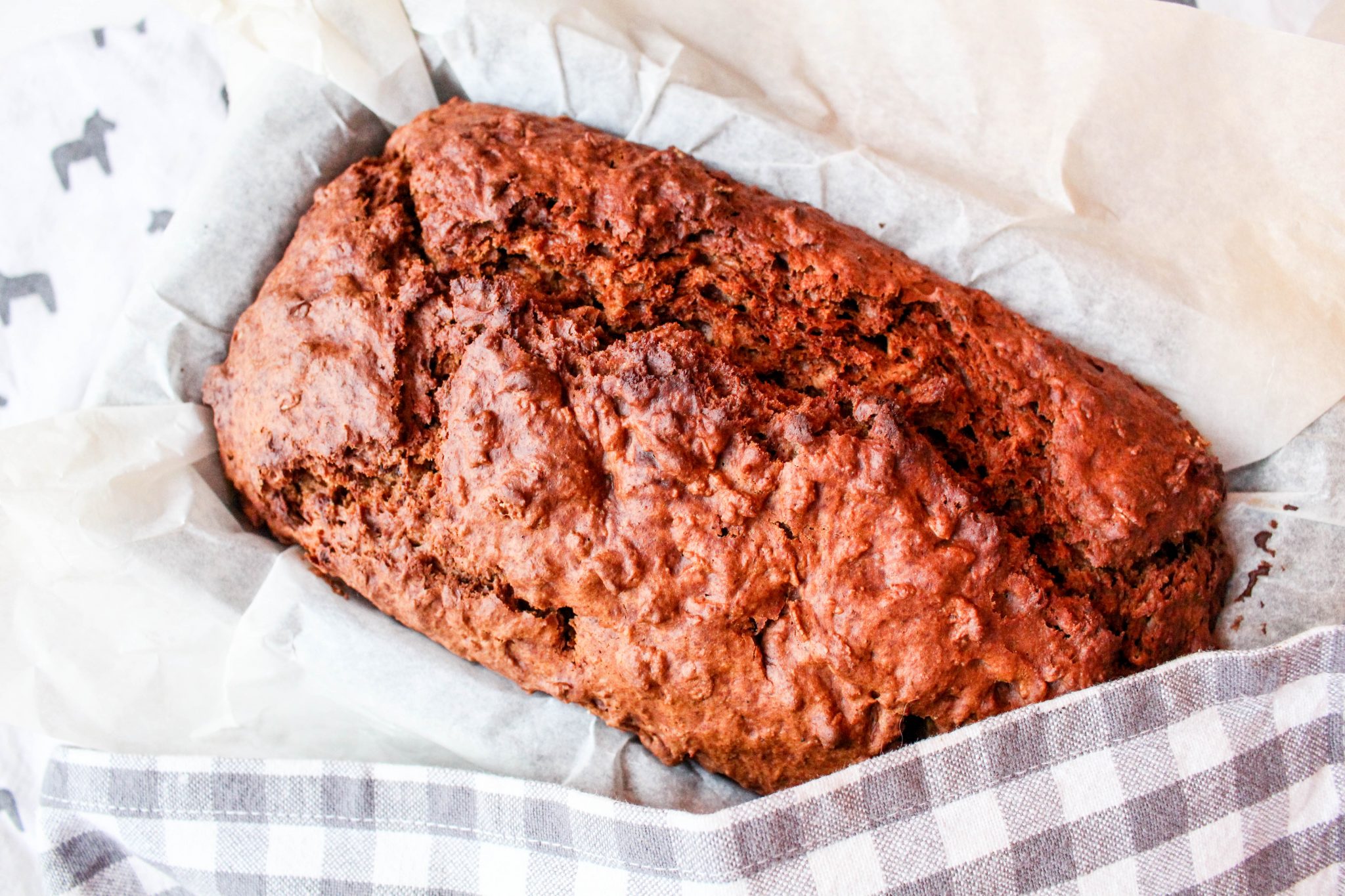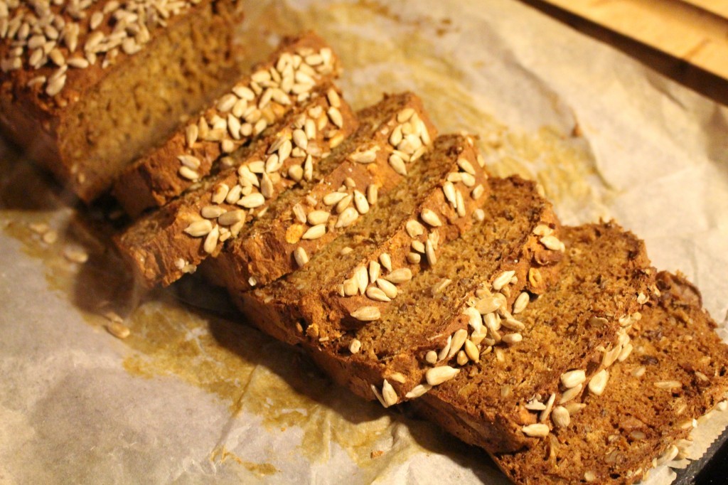 3) Klä en brödform med bakplåtspapper. Klicka i alla smet i formen. Platta till lite lätt uppepå. Här kan du också toppa brödet med t ex havregryn, lite rågsikt kanske eller varför inte lite solrosfrön eller pumpafrön.
