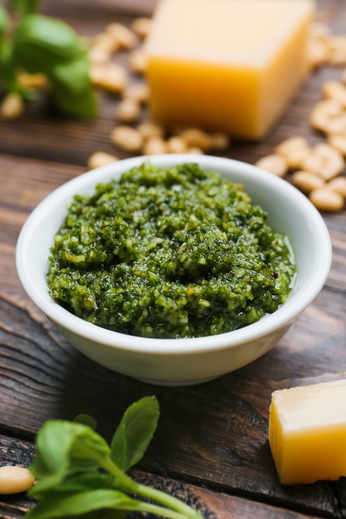 1) Mixa pinjenötterna med den färska basilikan, vitlök och olivolja.