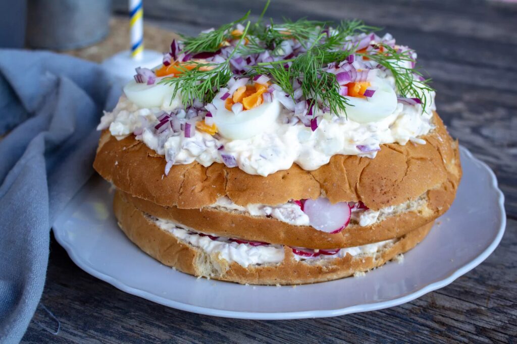 Ett tips är att också ha det inuti denna matjestårta. Sååå smarrigt med de lite sötsyrliga löken som gifter sig alldeles utmärkt till matjessill. Den här tårtan passar lika bra till midsommar som till jul.
