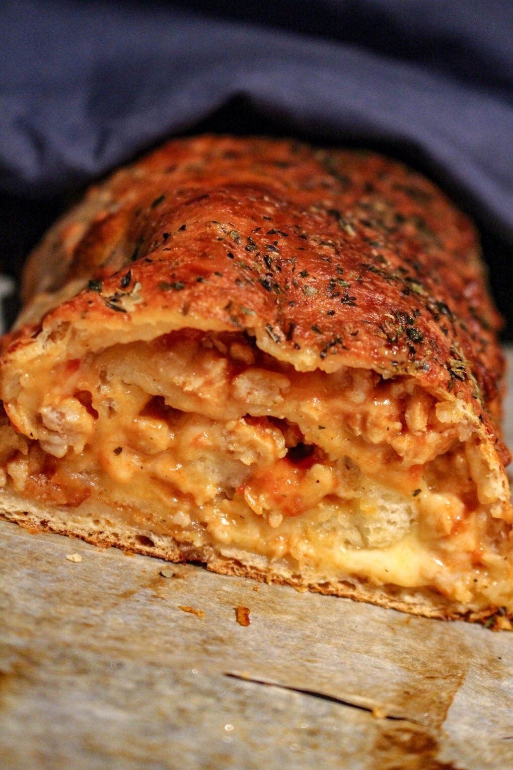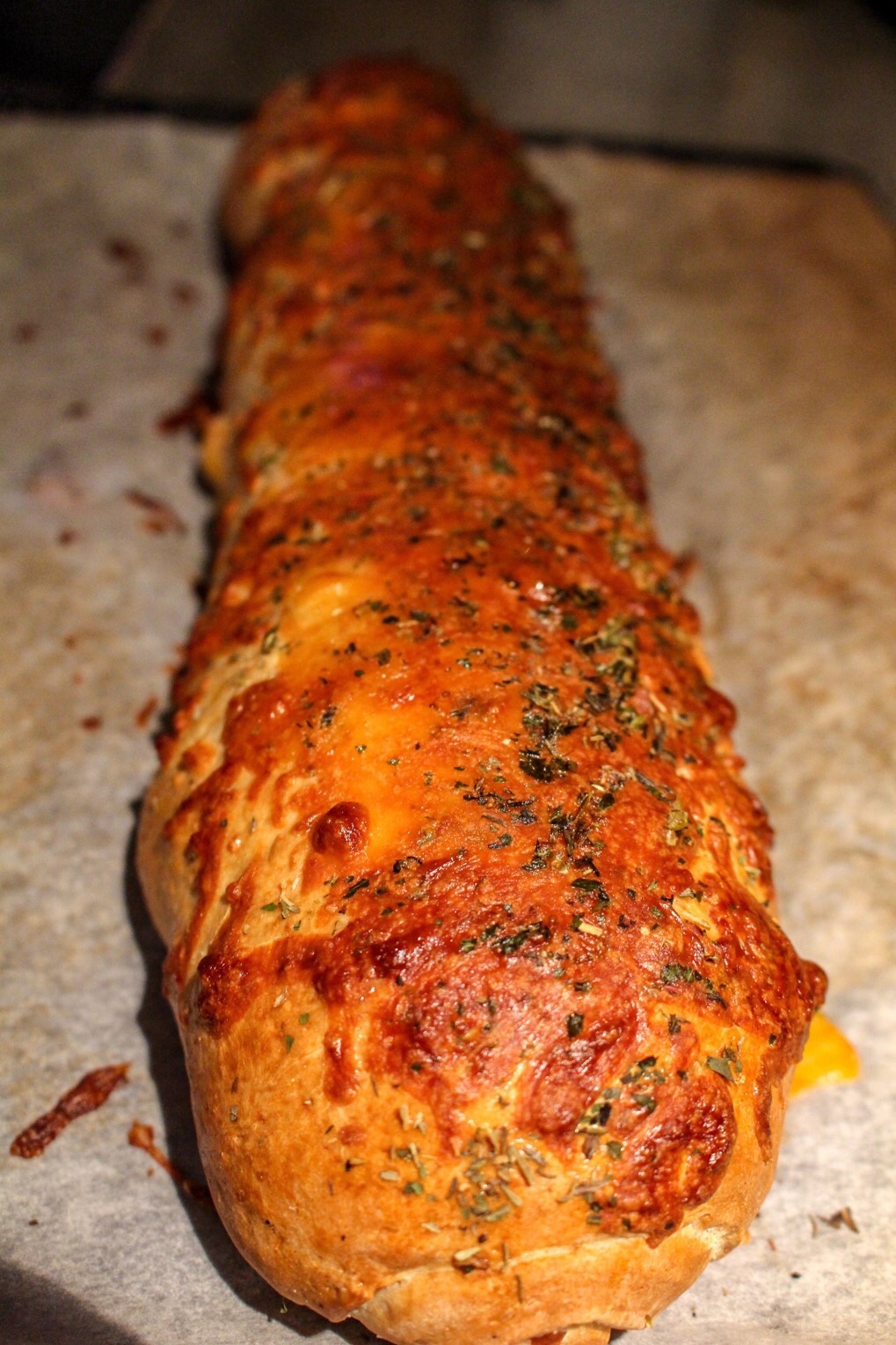 4) Rulla ihop rullen från långsidan och inåt. Pensla med ett uppvispat ägg, ha på riven ost och oregano. 225 grader ugnen i ca 20-25 min.