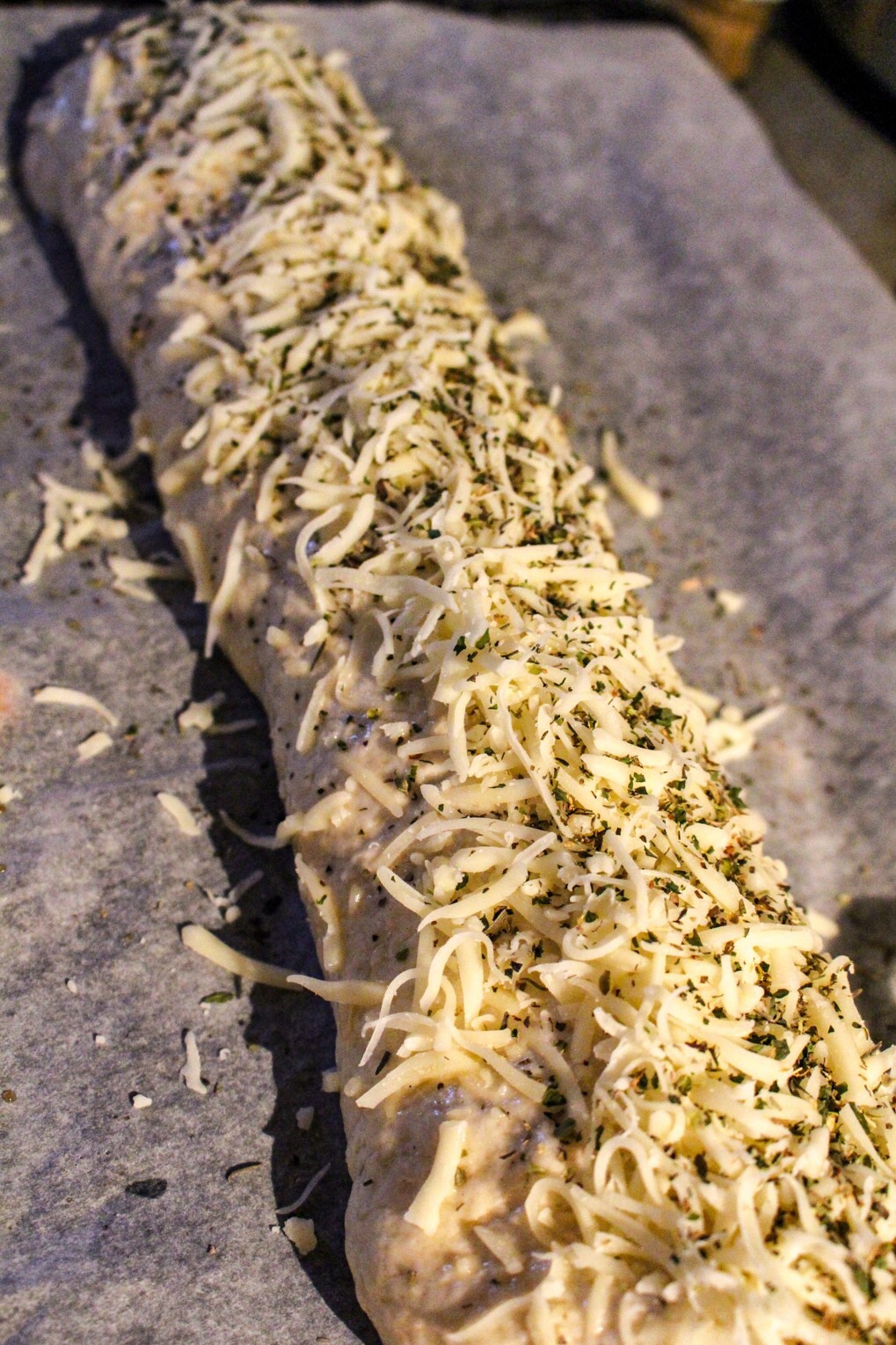 4) På med all riven ost, men spara lite till toppingen. Rulla ihop rullen från långsidan och inåt. Pensla med ett uppvispat ägg, ha på riven ost och örter. In i ugnen på 225 grader i ca 15-20 min.