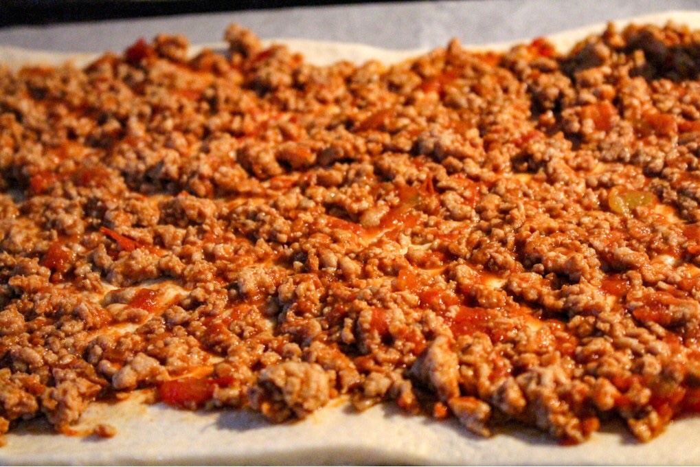3) Rulla ut pizzaplattan på en bakplåtpappersklädd plåt. Fördela ut kycklingfärssås över hela plattan.