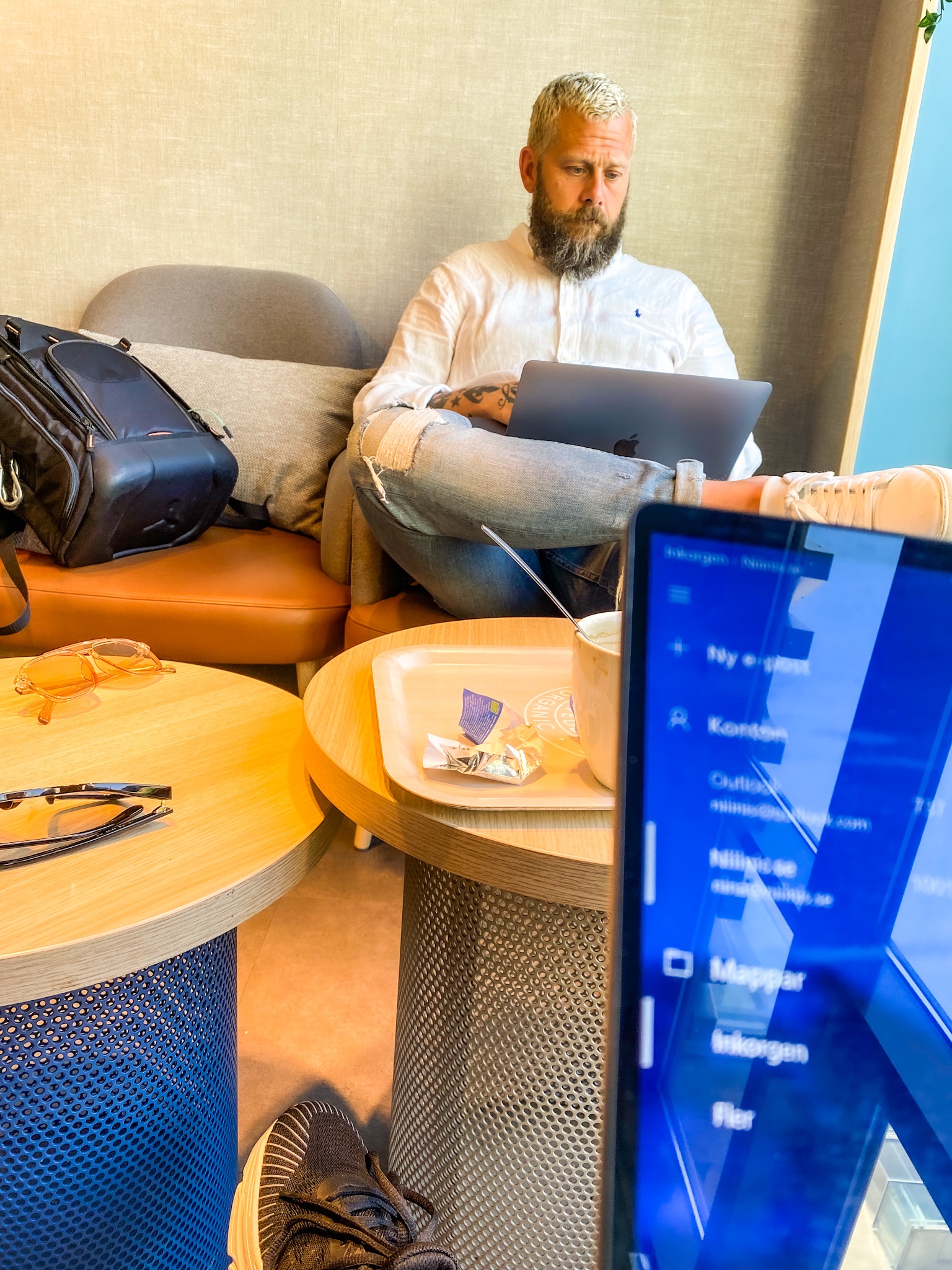 Här satt vi och jobbade på Waynes i väntan på ett möte. Jag har precis skrivit på ett ambassadörsskap som ska bli superkul att berätta om. Min ena frans hade dock lossnat från halva ögonlocket så jag såg nog rätt rolig ut mötet igenom. 😅