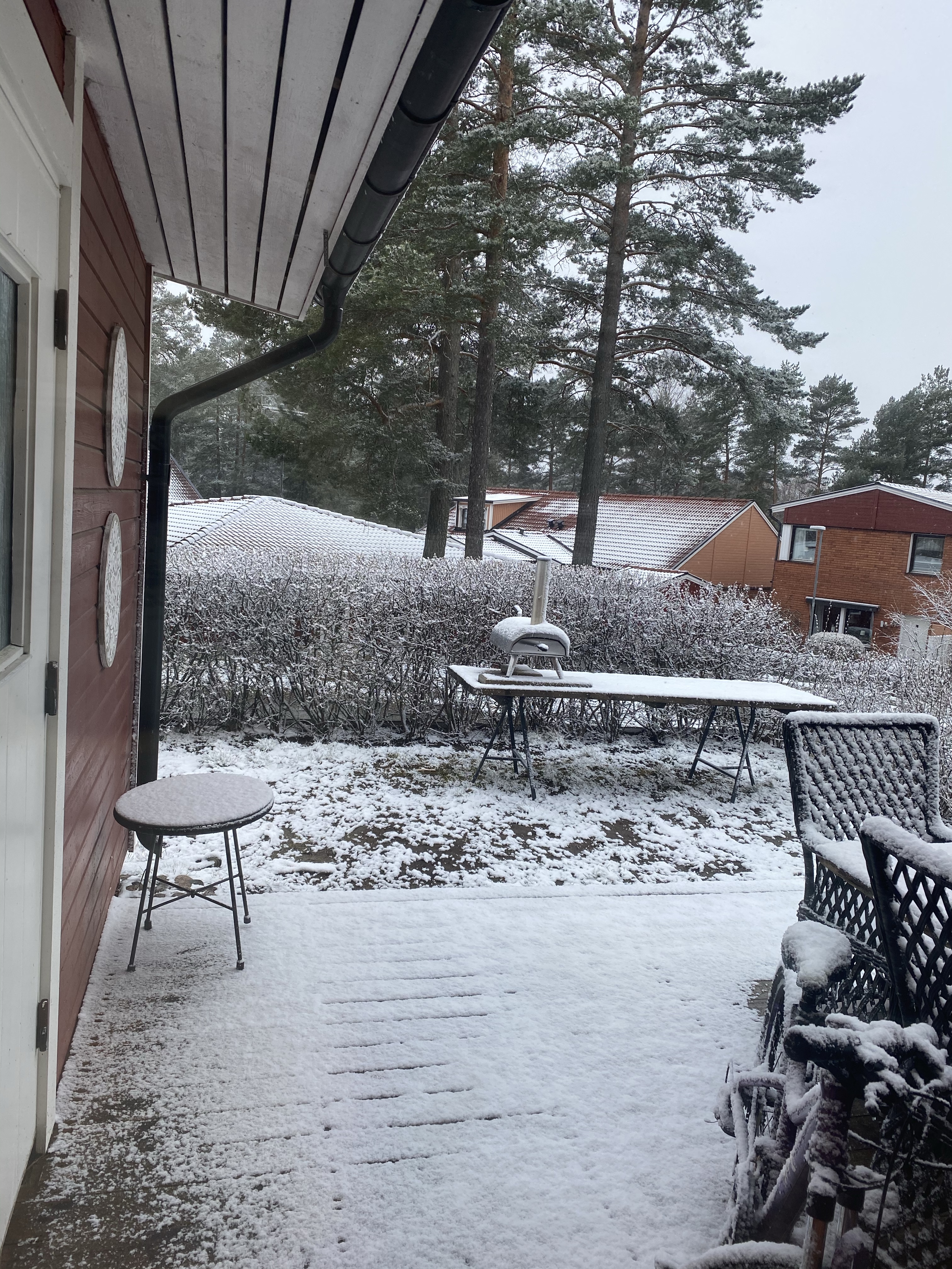 Det snöade hela förmiddagen så jag hann nästan bli orolig! En annan som fixade vår på allvar på altanen i förrgår. 😂🙈 Kan säga att dynorna till uteplatsen blev kvar ute, not so funny! 🙈 Håll med om att det ser lite deppigt ut med pizzaugnen i snön.