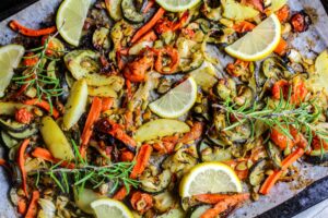 1) Skala och skiva upp morötter, löken och potatisarna. Tjoffa upp zucchini och tomater. Lägg allt på en bakplåtpappersklädd plåt. Häll över lite pumpafrön, havssalt, timjan och peppar.