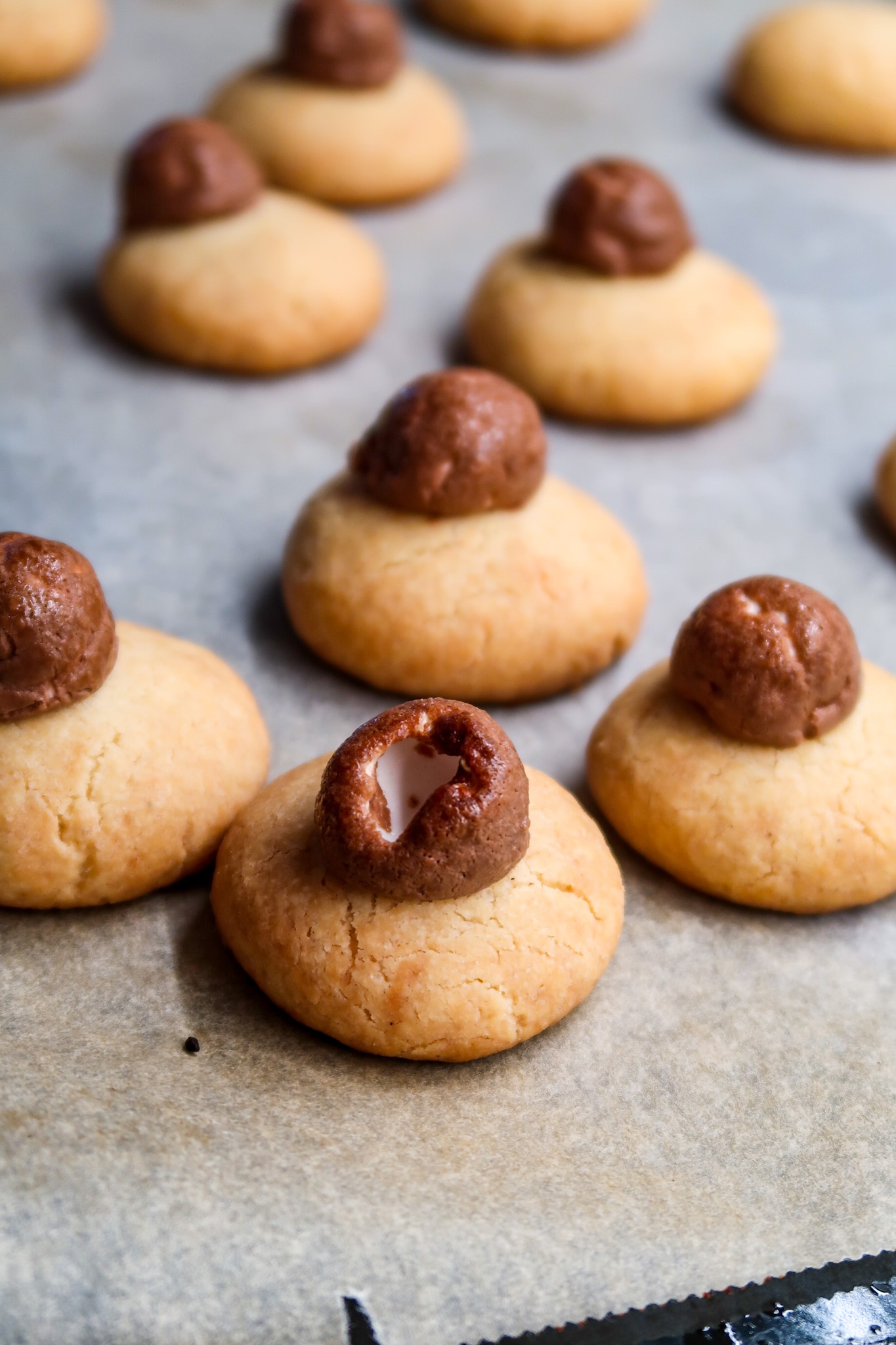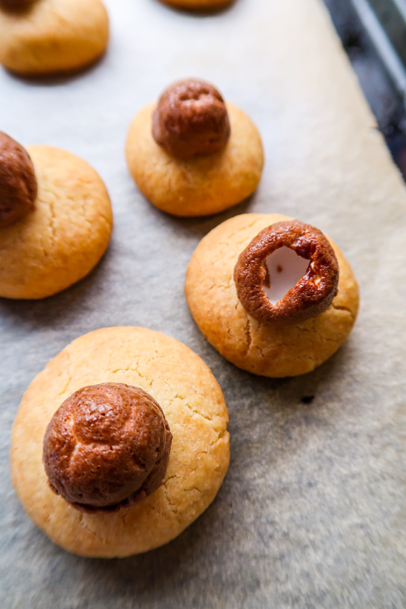 2) Forma 12 bollar av kakdegen och lägg på bakplåtpappersklädd plåt. Platta sedan till dem lite med handen innan du ställer dem i mitten av ugnen. Grädda ca 10 – 15 min. De ska få lite lite färg. När det är ca 3-4 minuter kvar på gröddningstiden så ta ut plåten och lägg en Polly på varje kaka.