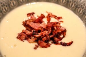 Den här potatis och palsternackssoppan blir himla god med lite knaperstekt bacon till. Det där salta knapriga till den krämiga lena soppan är en riktig höjdare.