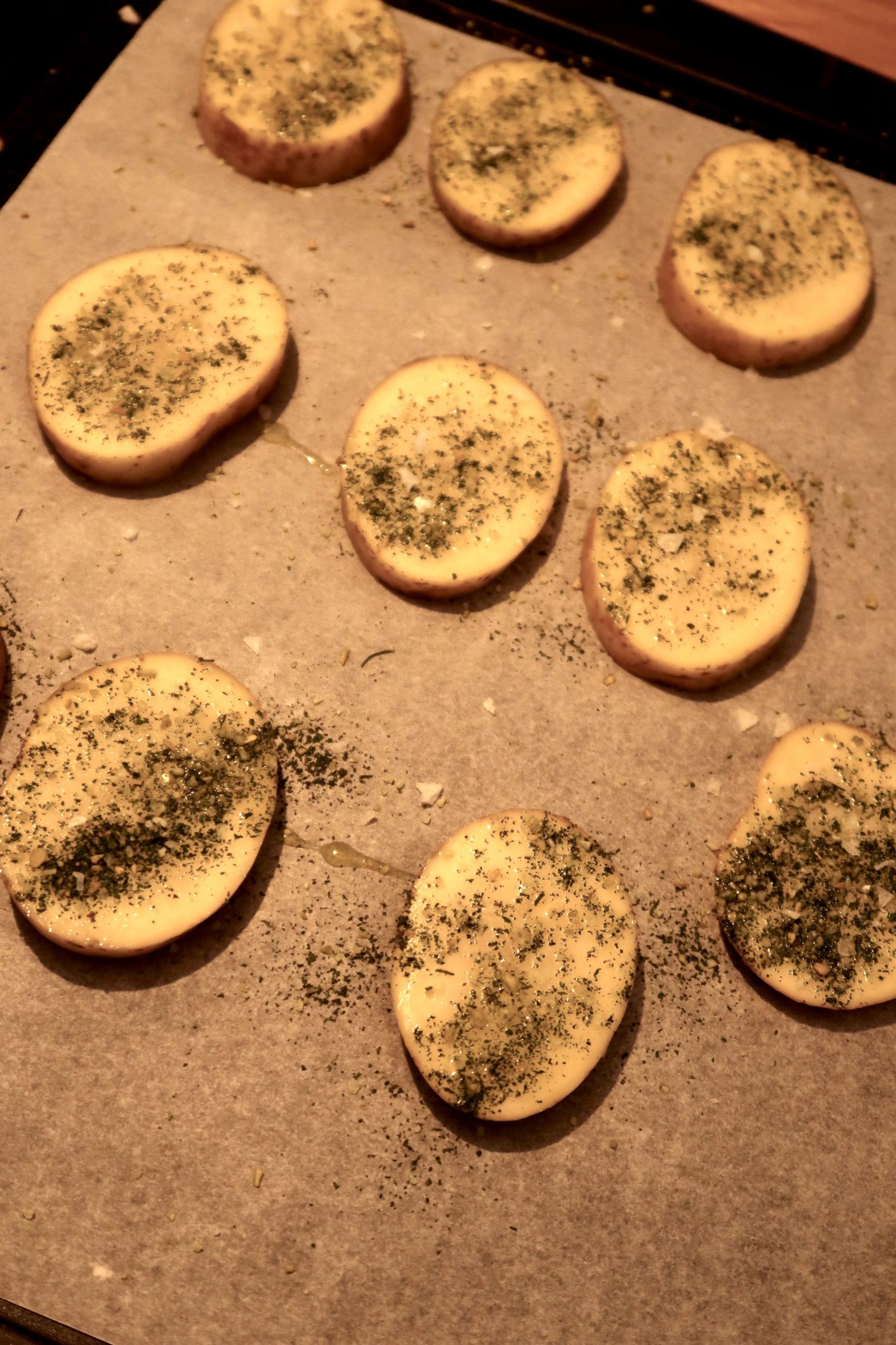 1) Bakpotatisgrund: Skiva potatisen i 12 skivor, de ska bli ca 1 cm tjocka. Olja varje skiva och strö på persilladekrydda och flingsalt. In i ugnen på 200 grader i ca 35 min, vänd dem och olja och krydda andra sidan efter halva tiden ungefär.
