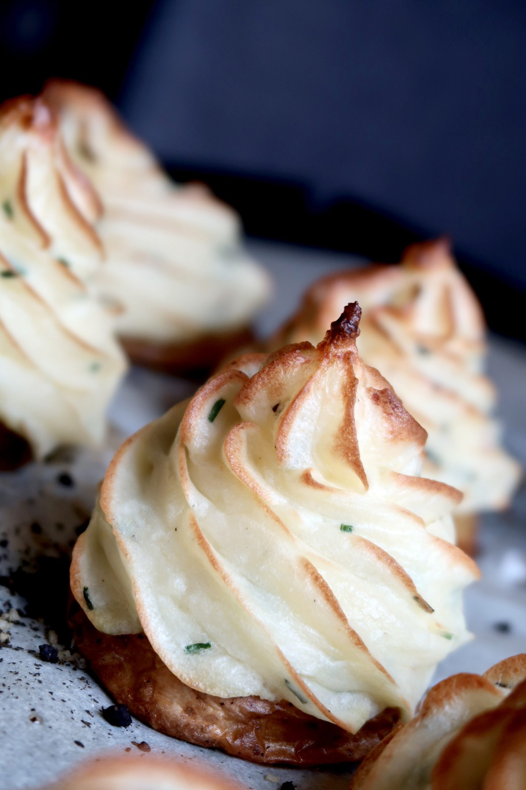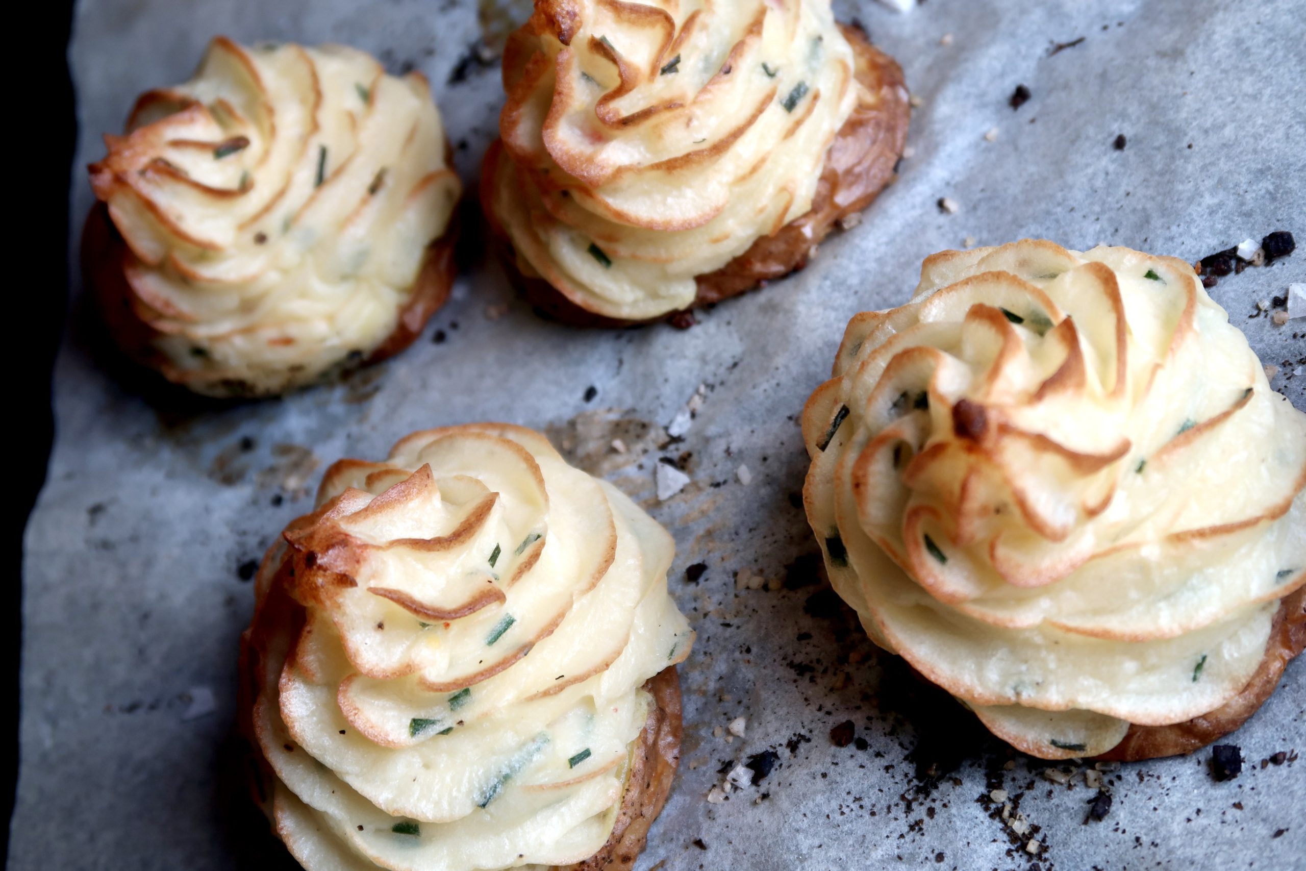 Lägg i potatismoset i en sprits och spritsa toppar på varje potatisskiva. Sätt ugnen på grill och varmluft om du har det. Skjuts in i ugnen tills potatisen fått fin färg.
