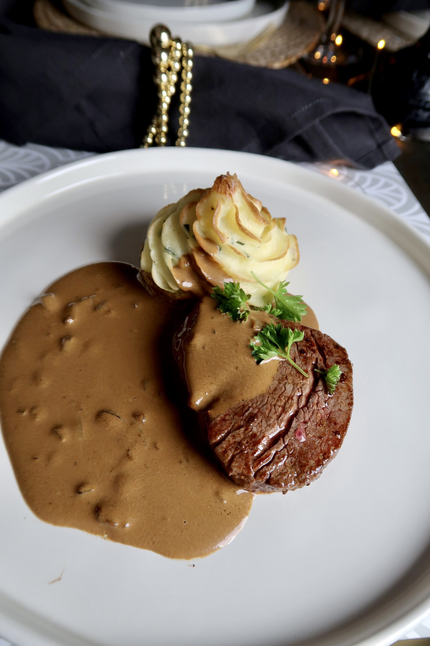 Jag har testat lite dukning här hemma och när jag ändå gjorde det så lagade jag suuuuupersmarrig middag som det ska bjudas på ikväll. Ja alltså bara vi i familjen ska äta. Den här middagen är perfekt på nyår men kvalar också in som en lyxigare Söndagsmiddag. Som ikväll. Tycker du köttet blir för dyrt kan du absolut byta ut det mot t ex fläskfilé.