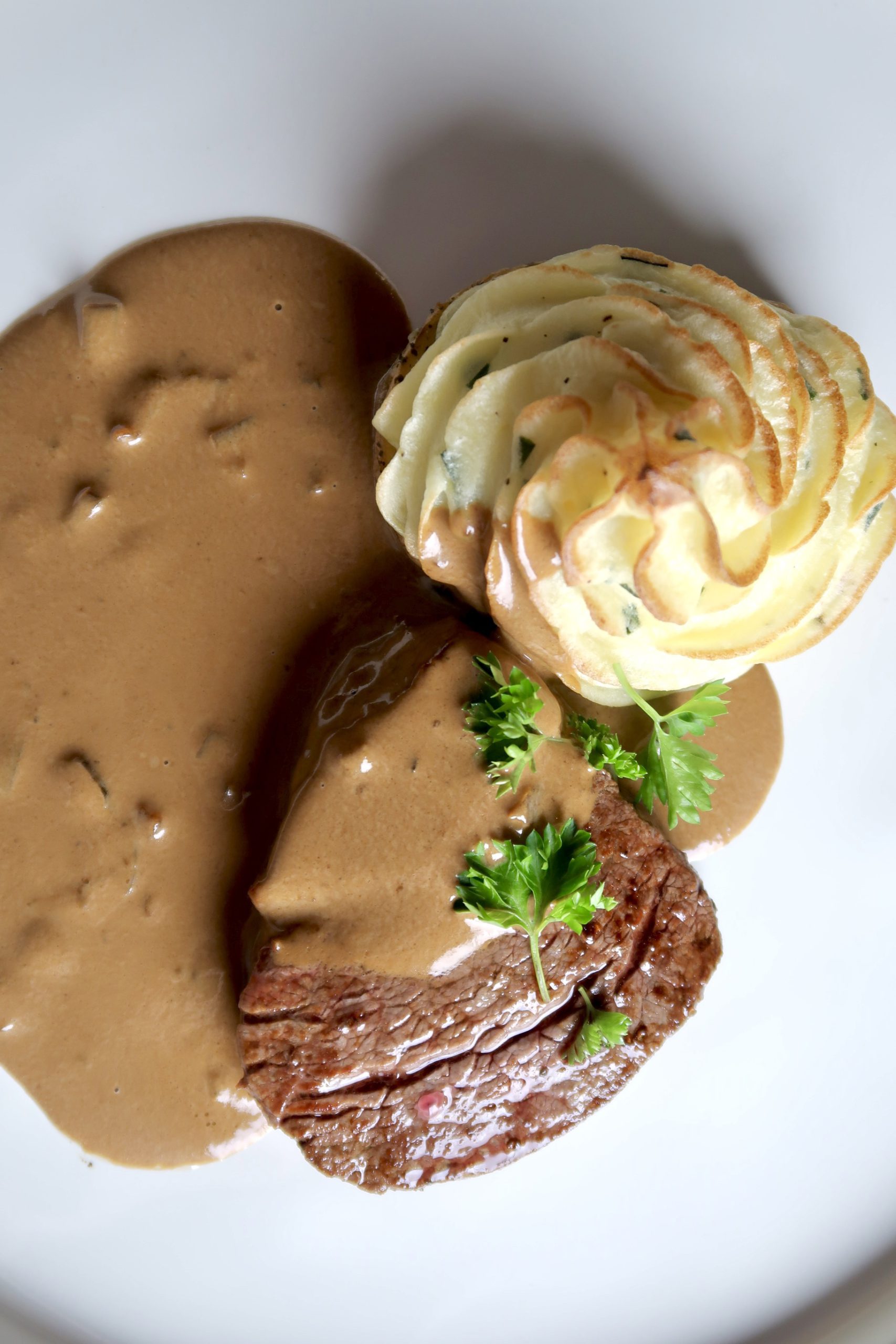 Maträtten ser väldigt god ut. Såsen vattnet hade jag hällt i pannan som man stekte köttet i och sen silat av använt till såsen.