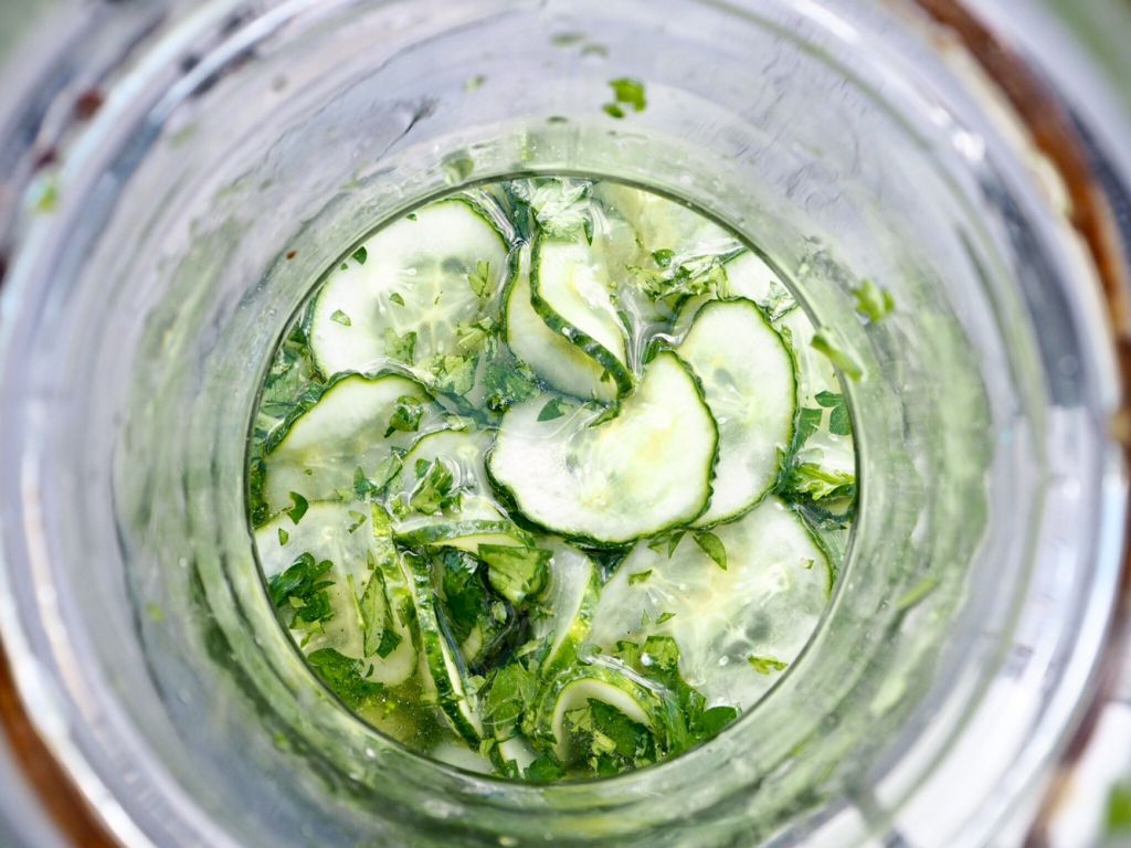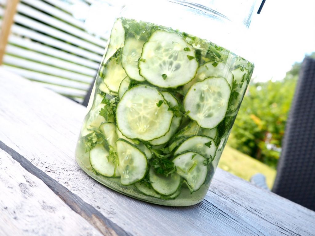 4) Blanda ättika, vatten, strösocker och vitpeppar. Häll över gurkan. Ha också i den hackade persiljan. Jag lät min sedan stå i några timmar innan vi åt av den. Så tipset är att låta den stå i kylen nån timma innan servering.