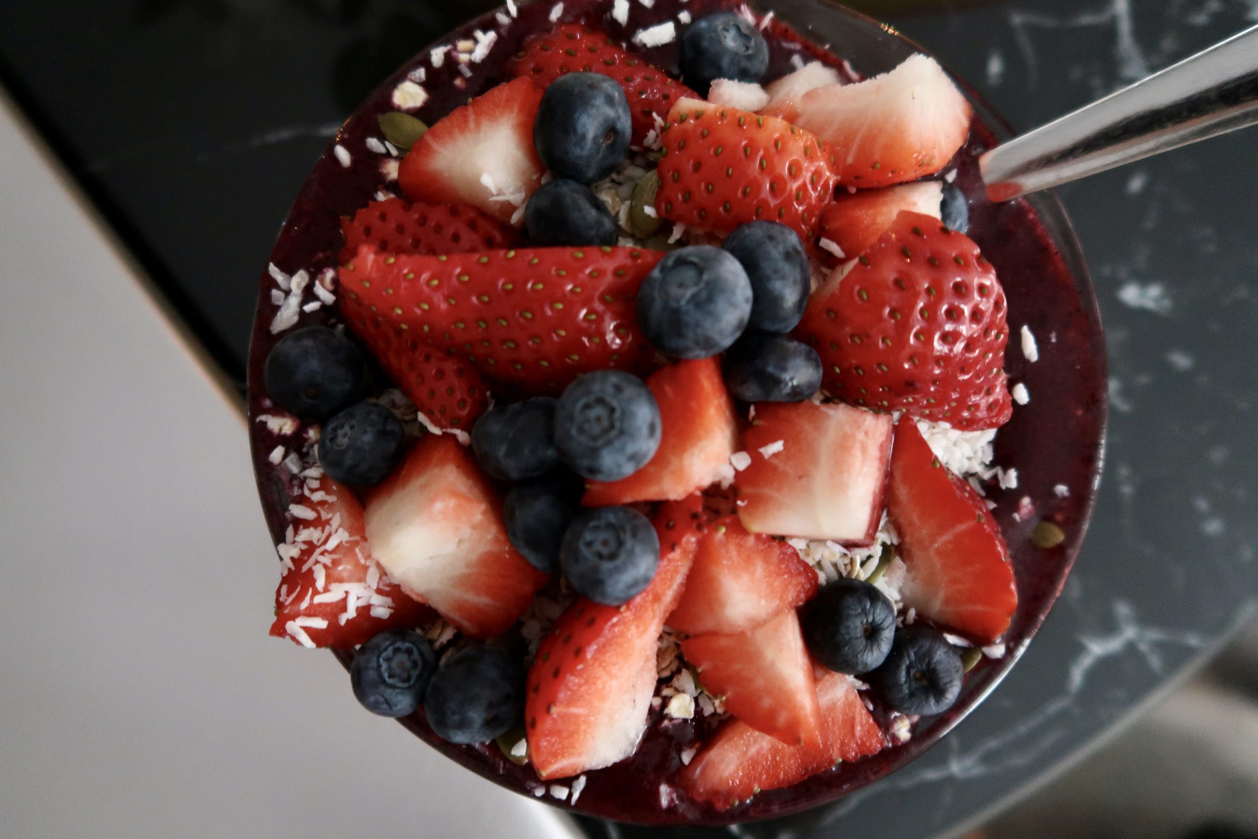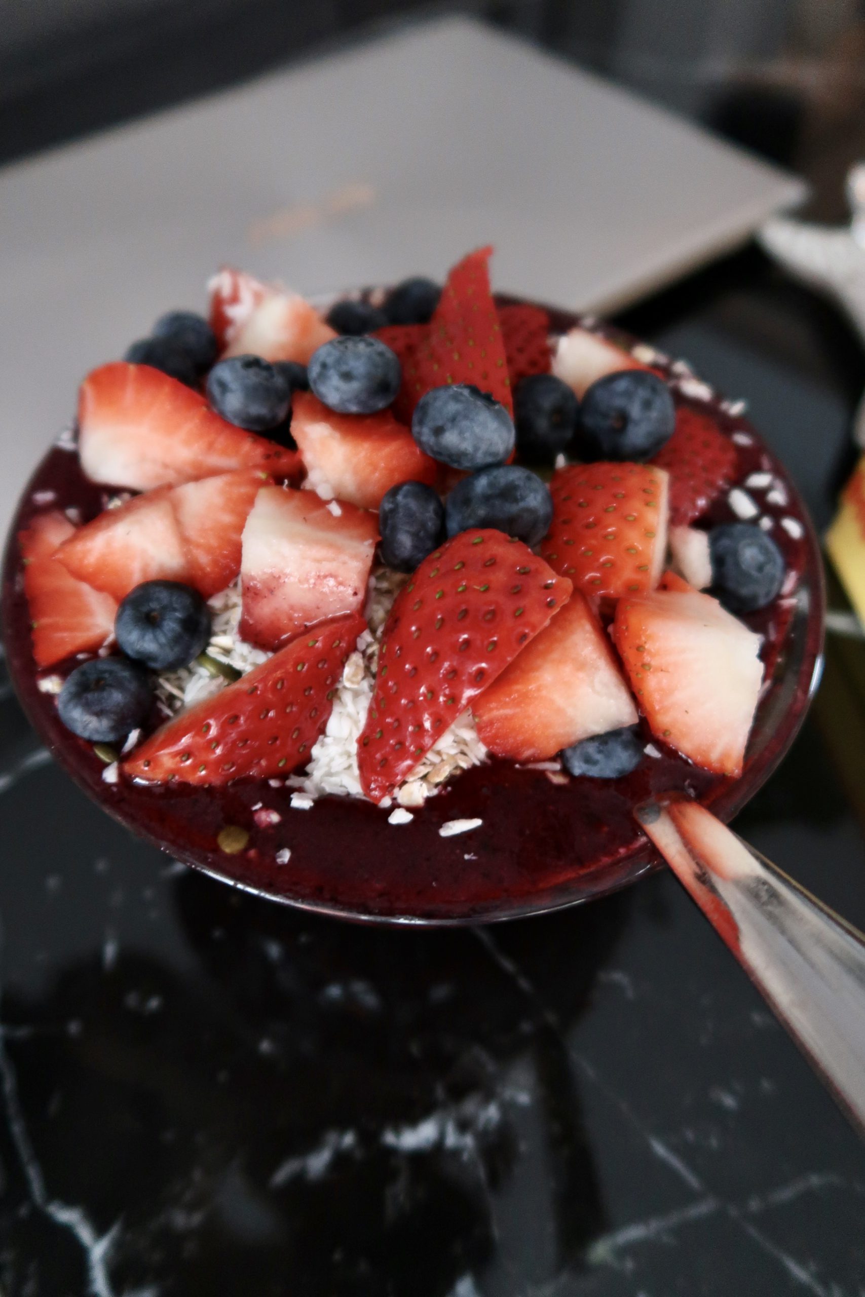 Här ligger en god frukost i magen. Den jag i stort sett äter varje morgon numera. 2 bananer, 2 dl frysta svenska blåbär och ca 1 1/2 dl vatten i blendern. Gäller sen smoothien i en skål. Sen äter jag antingen egengjord müsli, Fredrik Pauluns müsli eller så gör jag som jag gjorde i morse. Glutenfria havregryn, kokosflingor, färska blåbär och jordgubbar. Mums! Mättande och nyttigt.