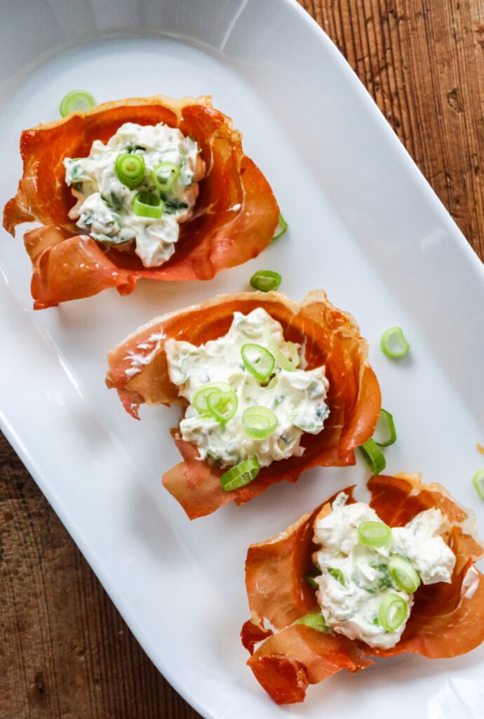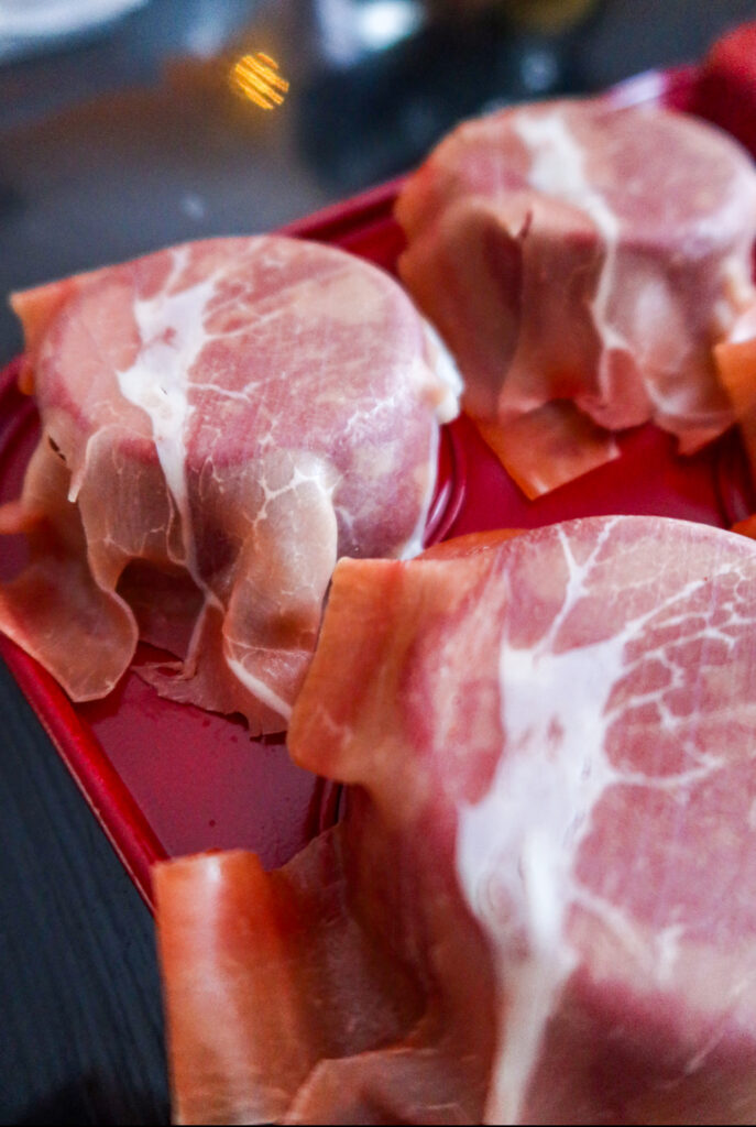 1) Ta en muffinsform och vänd den upp och ned. Klipp ut fyrkanter eller rundlar av bakplåtspapper och sätt på varje muffinsutbuktning. Ta en skiva prosciutto och lägg på varje muffinsform. Du kan behöva skära/klippa av dem lite så de inte blir för långa. Sätt ugnen på 200 grader, ställ i ugnen i ca 8 minuter.