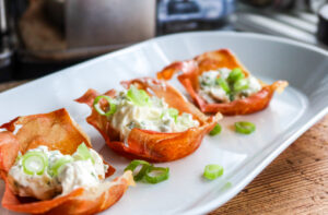 3) Blanda alla ingredienser till fyllningen. Fyll varje korg med fyllningen och toppa med lite salladslök. Servera.