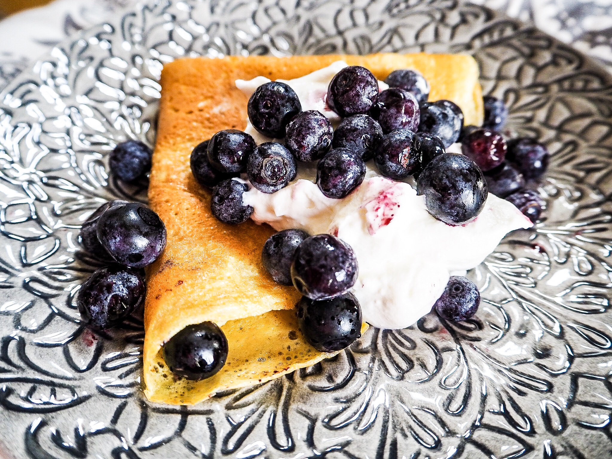 4) Grädda 6 st fullsize pannkakor. Tänk på att göra dem tunna. Servera med turkisk yoghurt och valfria bär.