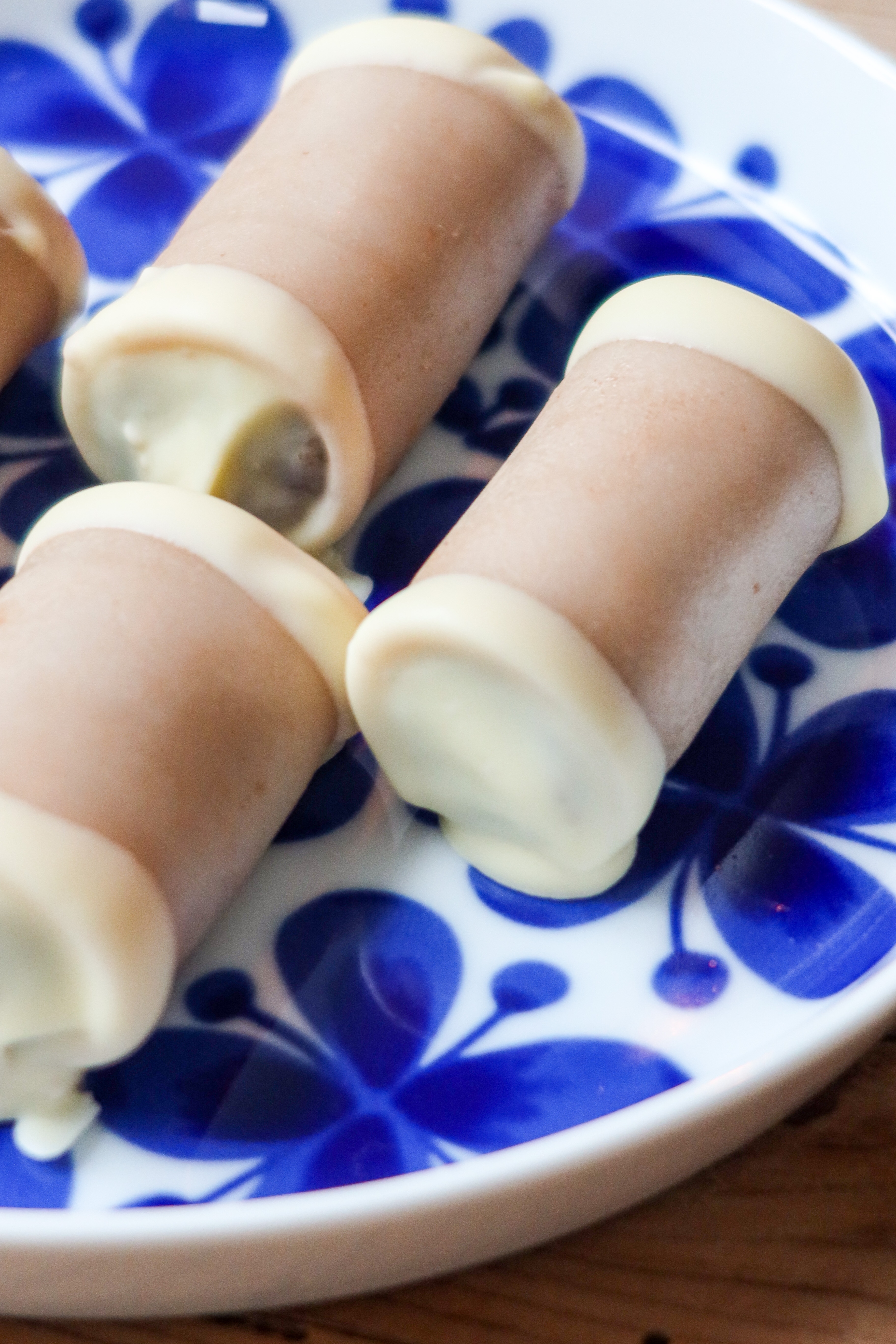 2) Forma till avlånga runda bitar, klä varje bit med marsipan. Gör du den lite långsammare varianten så kan du rulla degen till två lika långa ormar som du ställer i kylen i en halvtimma. Klä rullarna med marsipan och sedan skär du varje i ca 4 bitar.