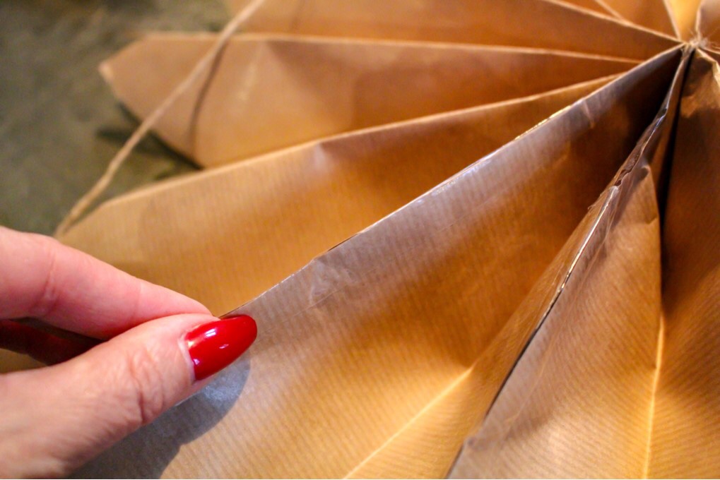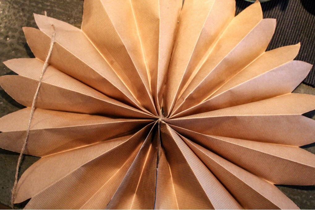Dra sedan ihop den till en stjärna, tejpa, limma eller häfta så det blir till en stjärna.
