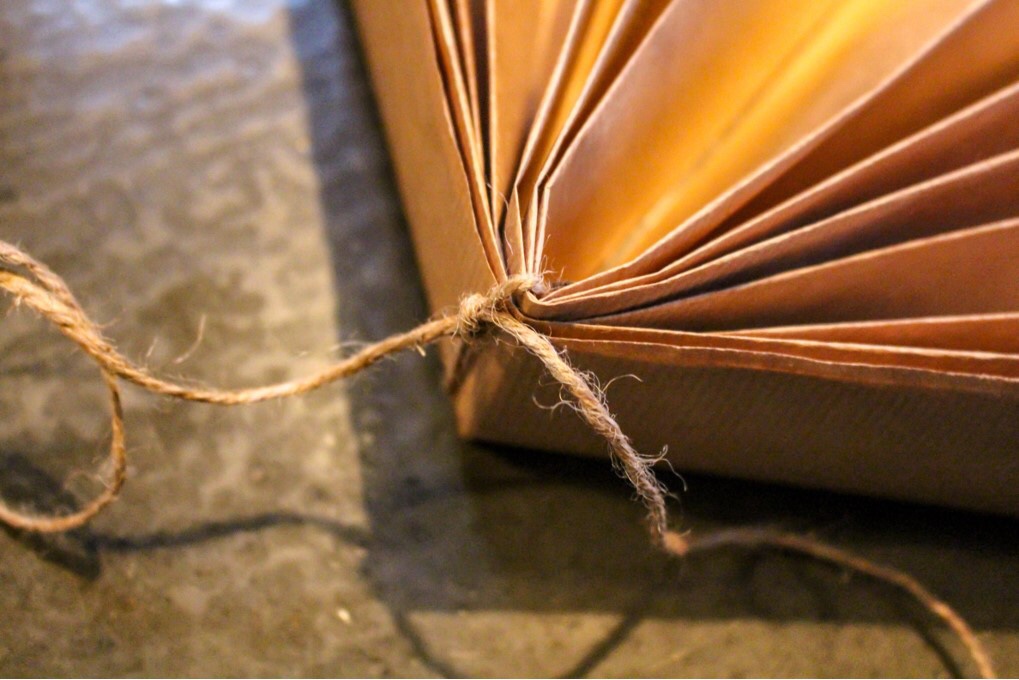 Dra ett snöre runt och knyt. Klipp bort överflödigt.