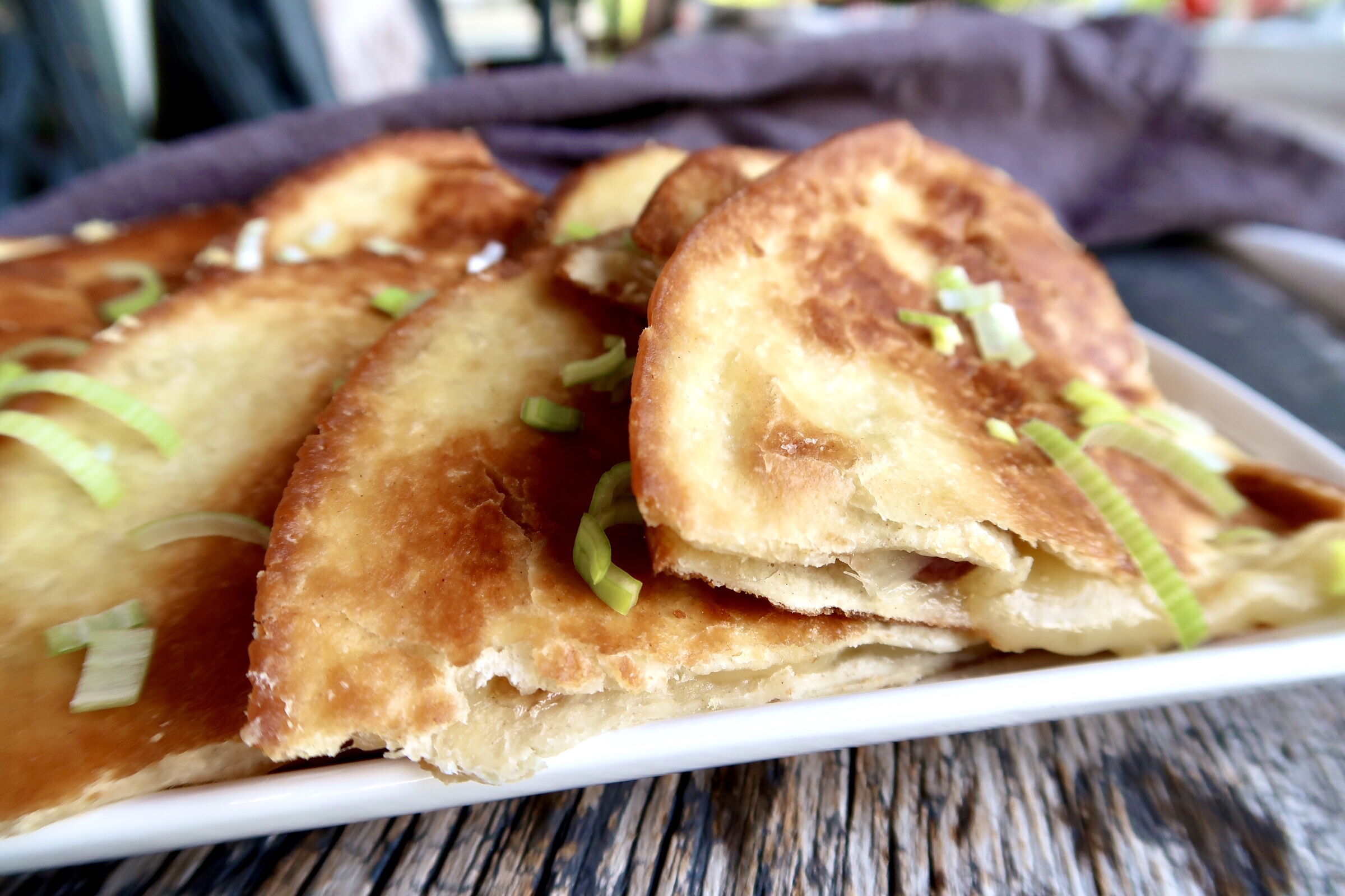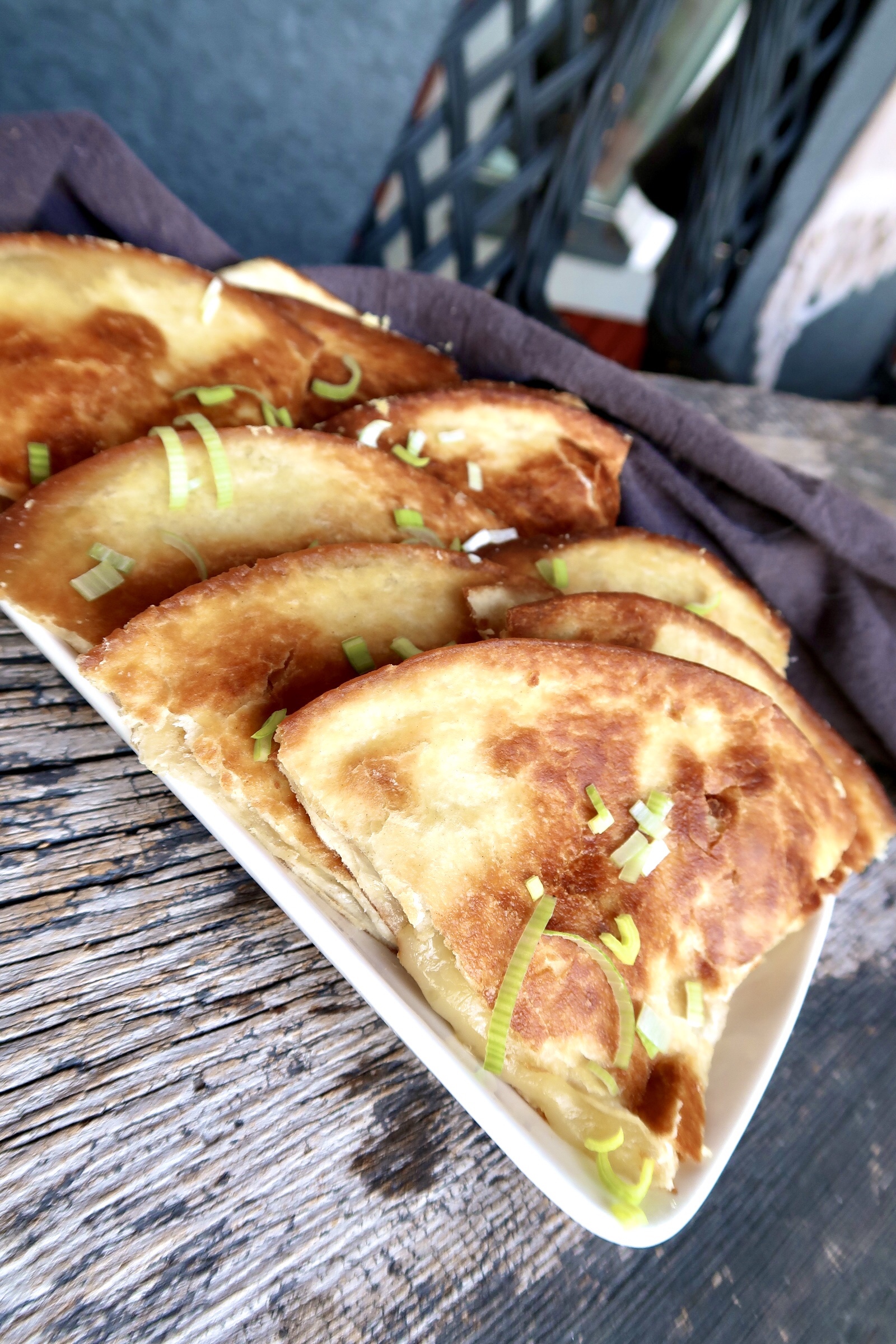 2) Lägg på de 2 tortillabröden och pressa ihop. Stek bröden i rikligt med olivolja på medelhög värme. Någon minut på varje sida, osten ska smälta fint inuti. Ytan ska bli gyllene och frasig. Dela varje i 4 bitar och servera med lite färsk purjolök.