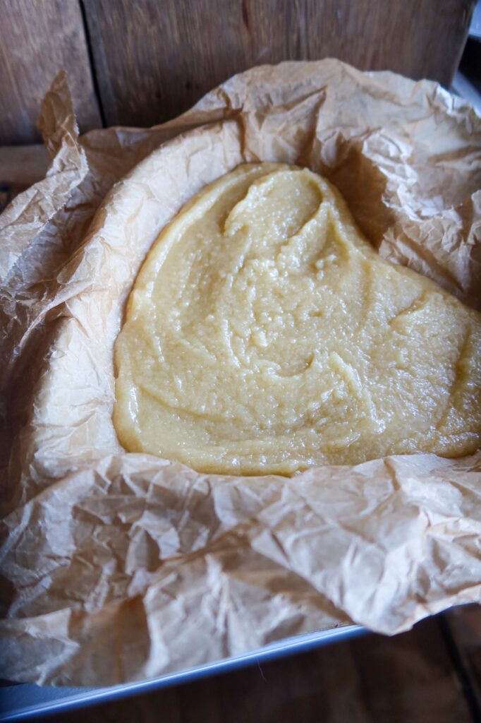 1. Börja med kakan. Smält smöret. Rör sedan ihop alla ingredienser i en bunke, lägg bakplåtspapper i en ugnsform eller pajform. Denna har en omkrets på ca 24 cm (även om den är hjärtformad). Fördela ut kakan i den, grädda på 200 grader i ca 15 min eller tills kakan fått fin färg.