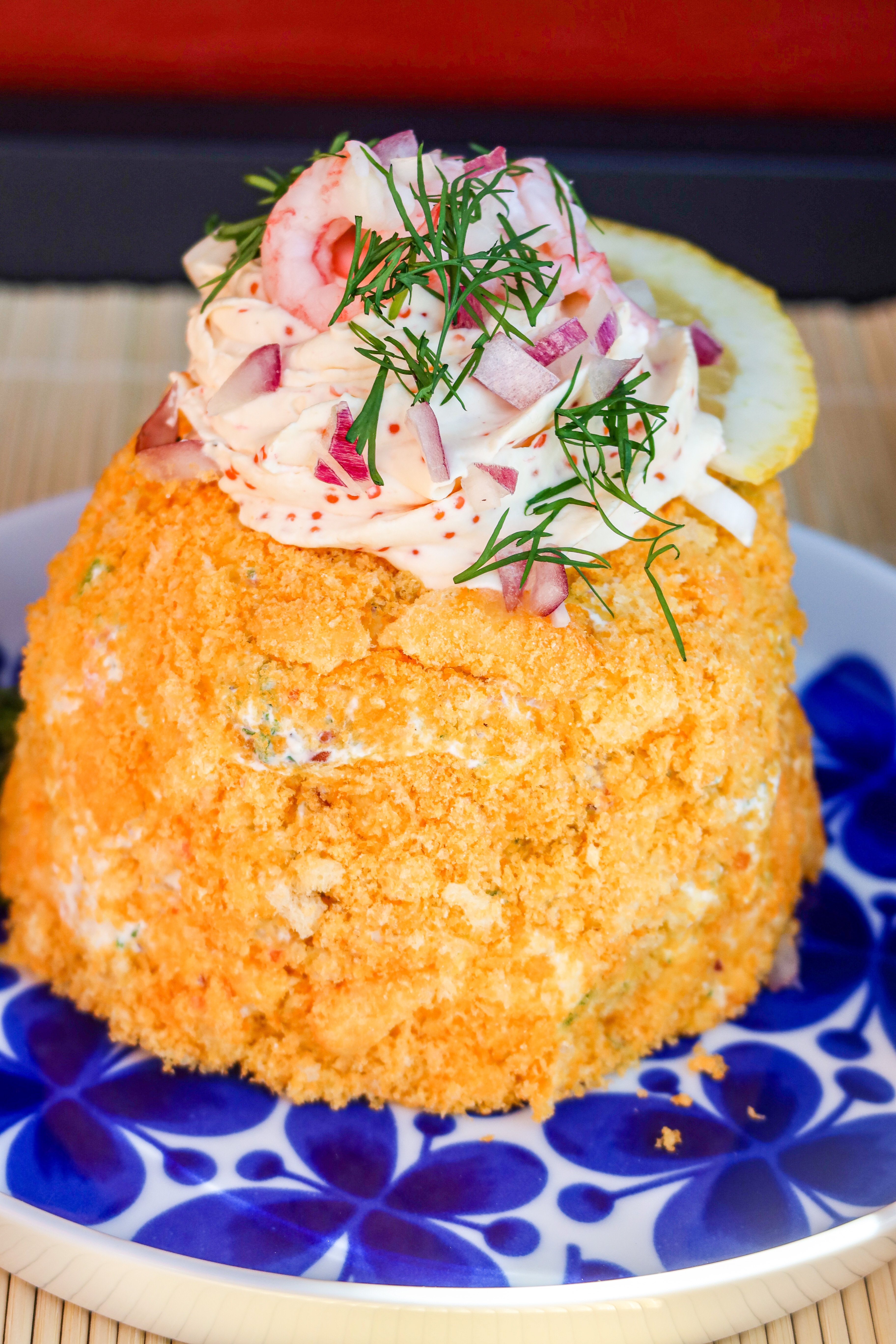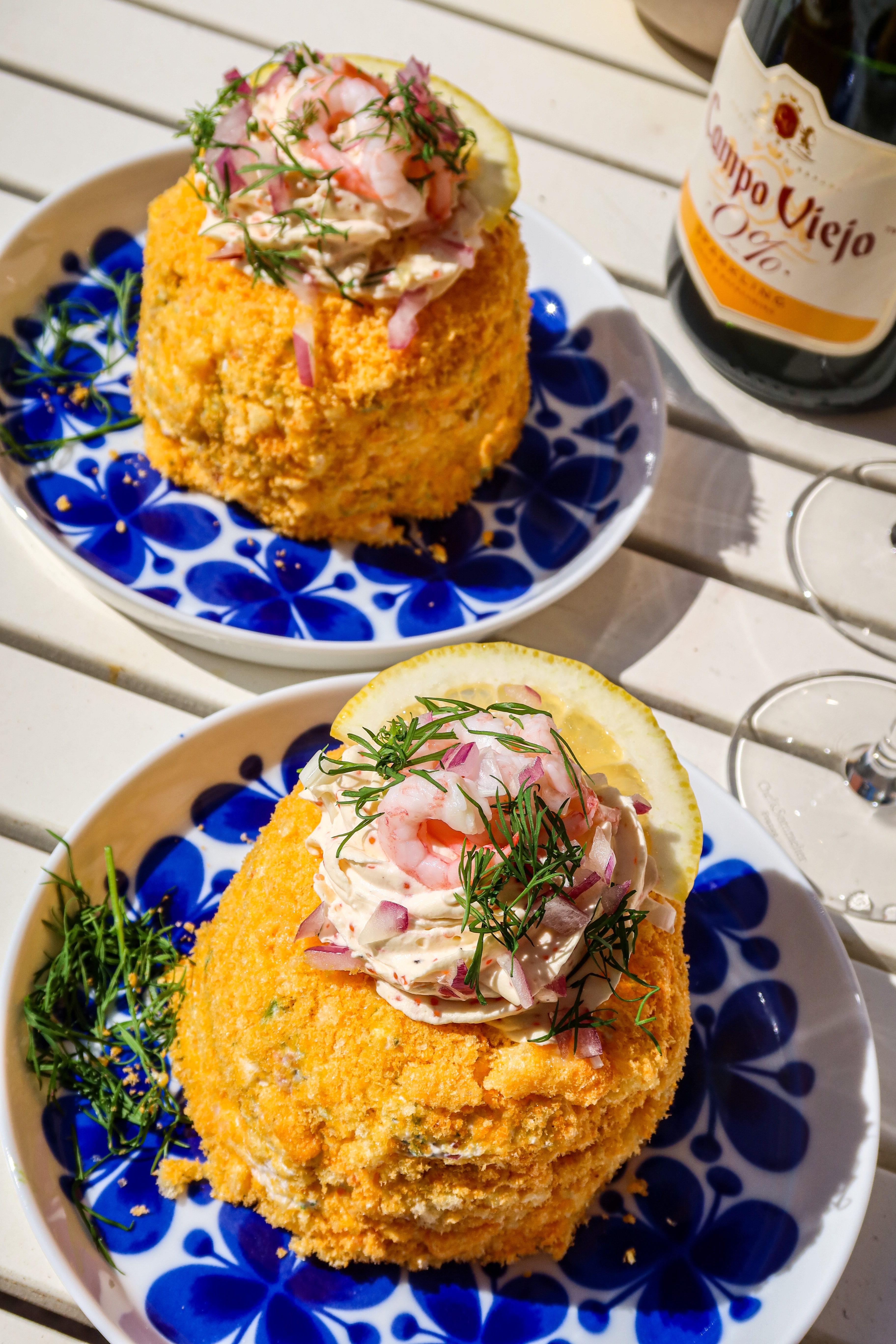 7) Dekorera: På med några räkor, hackad dill och hackad rödlök.
