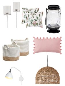 Blommiga kuddar och rosa bollkuddar i soffan. Härliga ljushållare i glas och så den där svarta som påminner om en Mason jar. Nya sänglampor och kanske en ny kökslampa också. Korgarna är fina att ställa lite toapapper och handdukar i på toaletten, tänkte skruva fast dem på väggen.