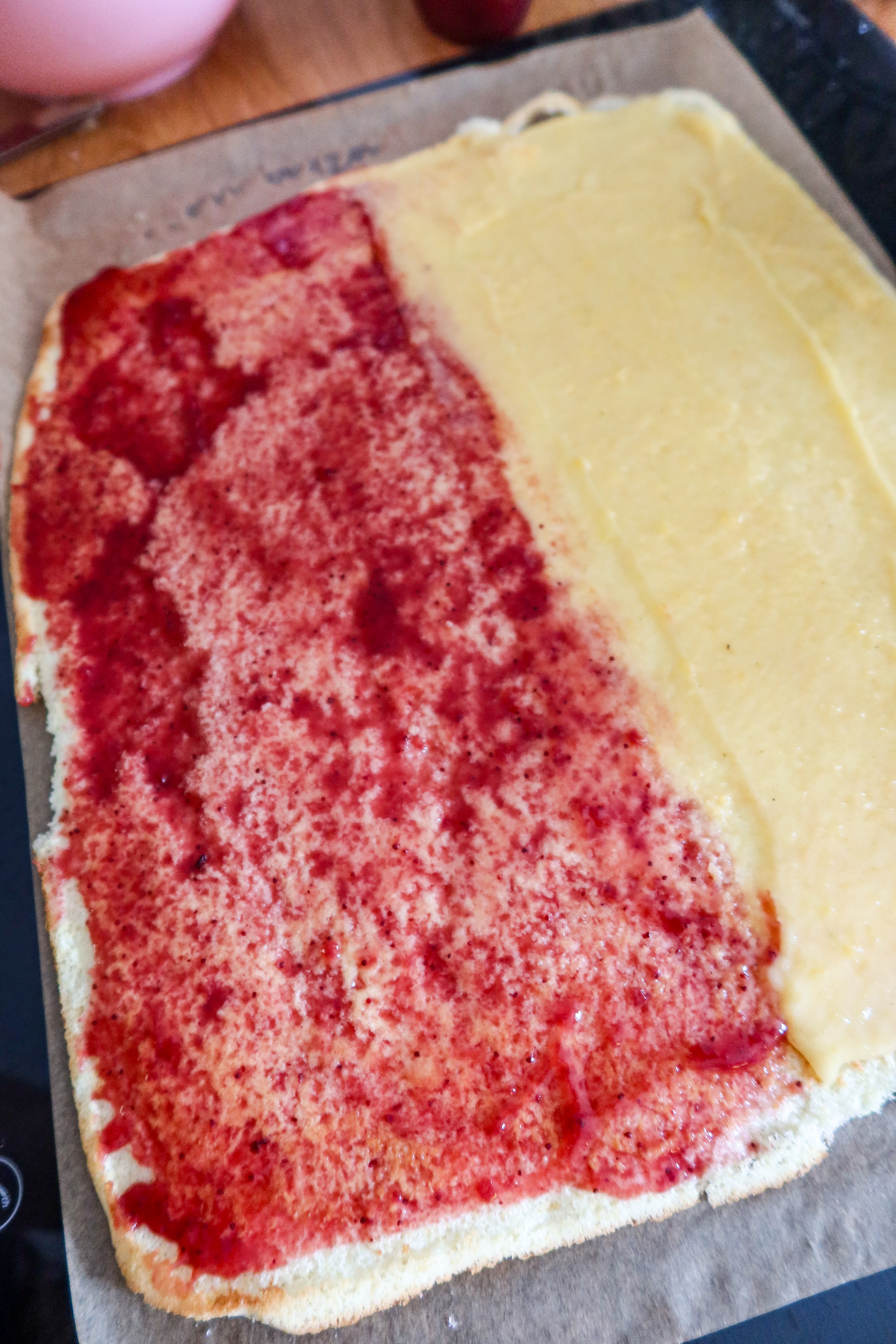 5) Bred på jordgubbssylten över halva, och vaniljkrämen över den andra halvan. Köp t ex Ekströms marsansås och gör vaniljkrämen. Du kan också göra egen, recept HÄR