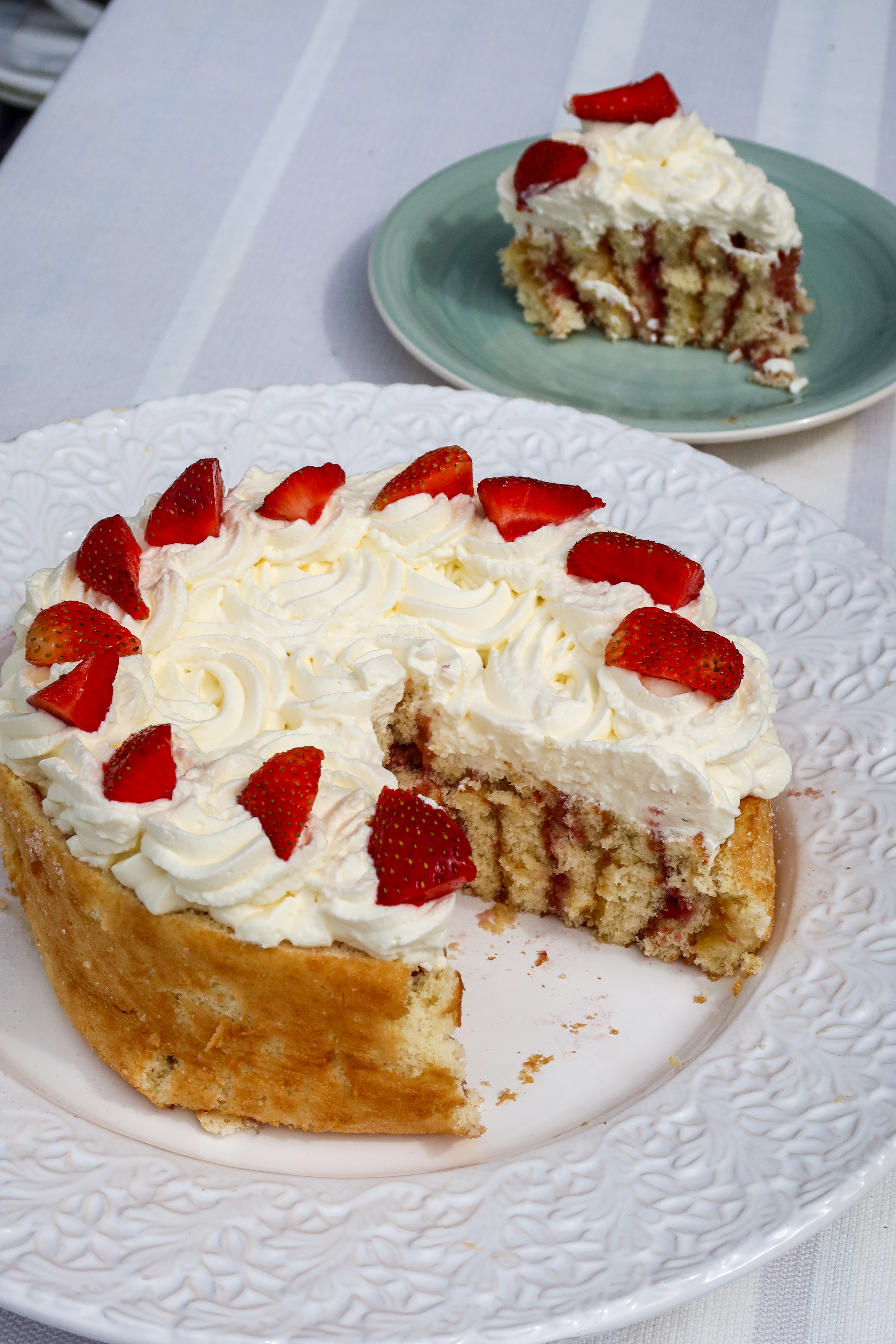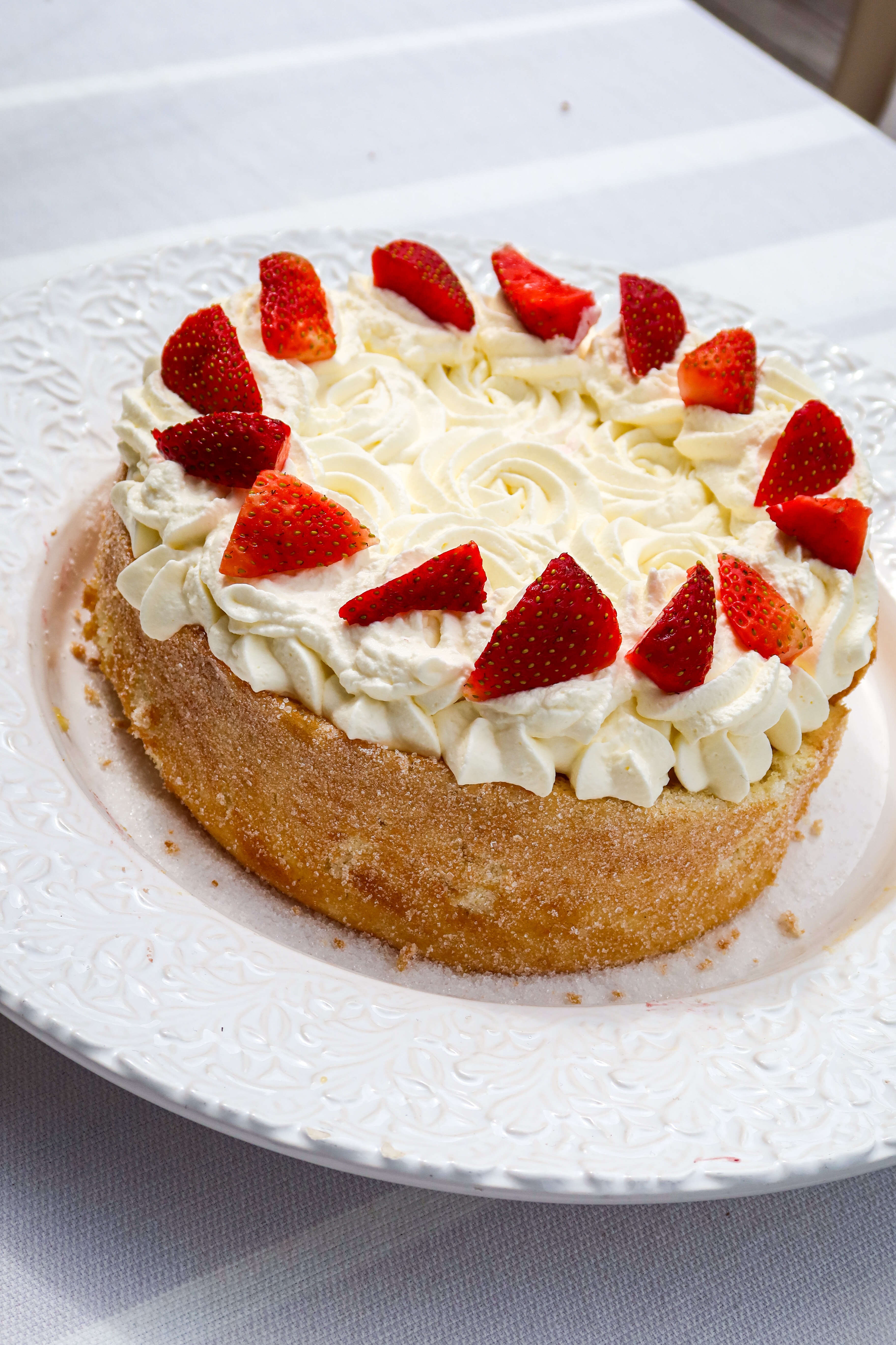 8) Vispa grädden och toppa med den, skär några jordgubbar och lägg på. Servera.