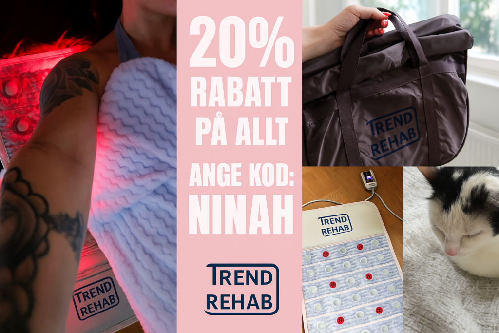 Påminner om min rabattkod. Unna dig något från TrendRehab – IR-produkter, massage, träning eller ljusterapi. Med koden NINAH20 får du 20 % rabatt på hela köpet.