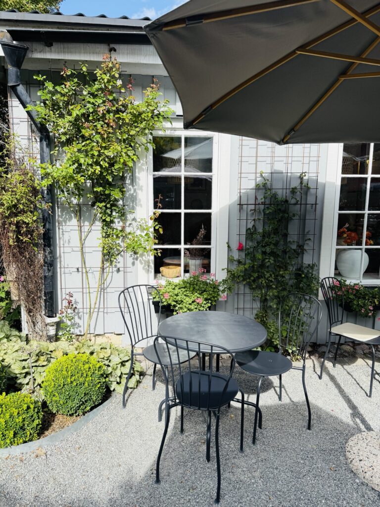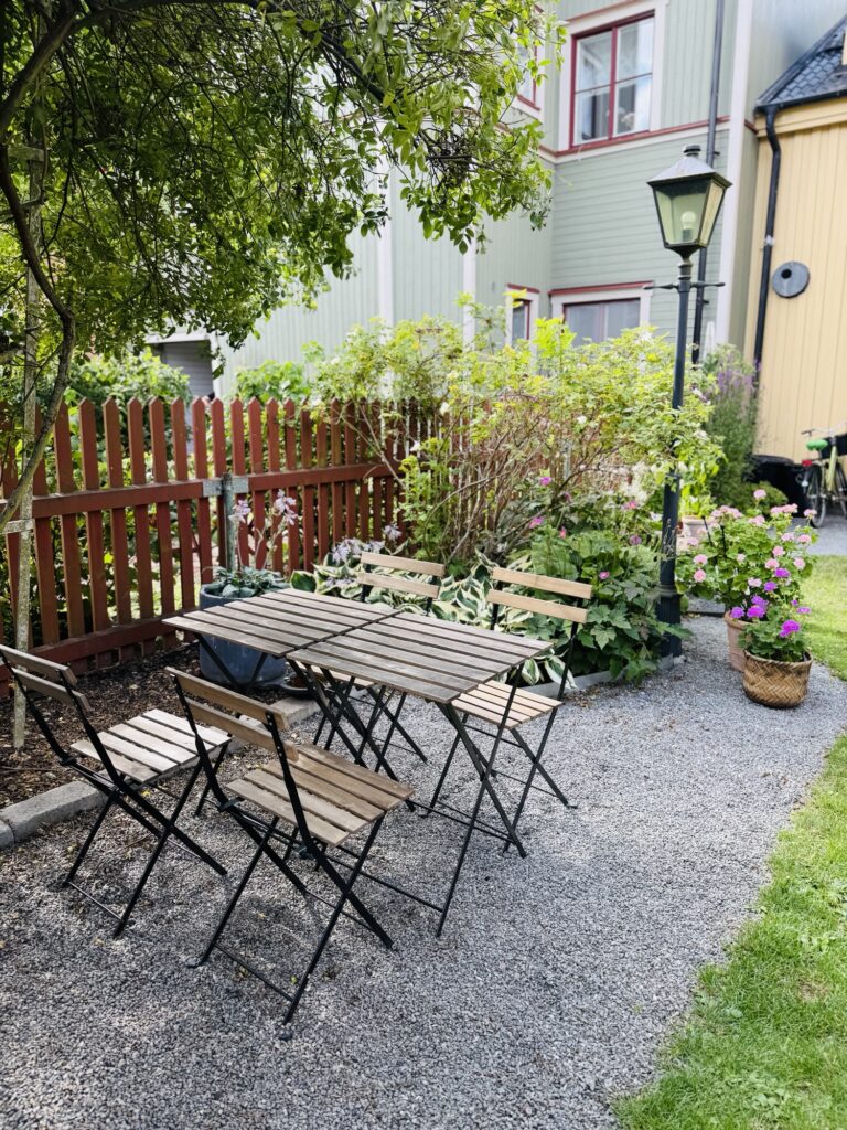 Alldeles fantastiskt mysigt på denna innergård. Det roliga är att jag satt och mindes tillbaka, för att precis bakom det vita staketet bodde jag i min ungdom. Vilda fester, killar och outfits – alltså jag bodde där som 20 åring. När livet var som allra roligast. Åh herreminjee så mycket roliga minnen jag har därifrån. Inte ens rumsrena storys alla gånger, inte när en av ungarna, ex-sambo och nuvarande man satt där dessutom. Hahaha….. alla har vi varit unga en gång i tiden. 😜