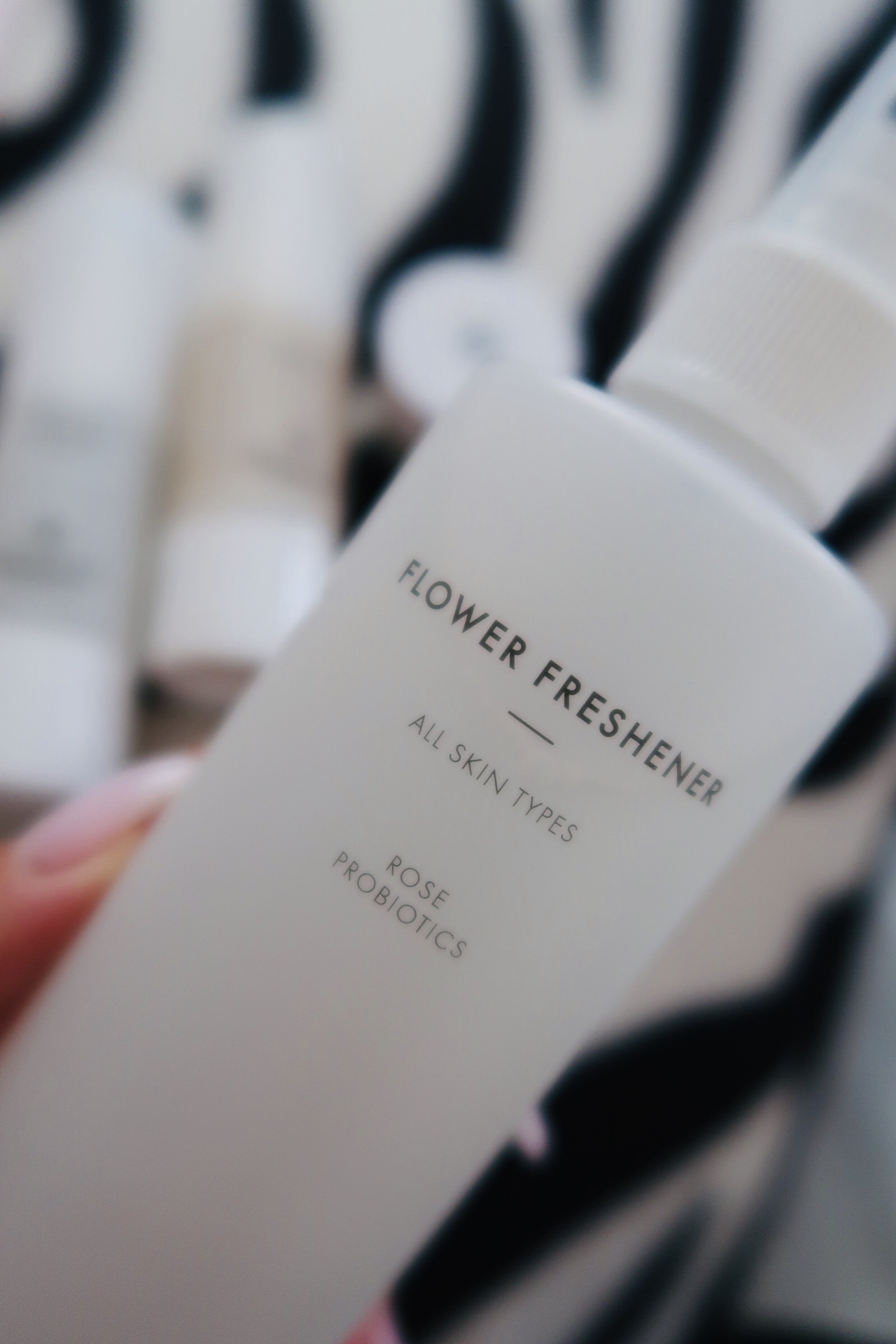 Flower Freshener (Ansiktsvatten\Mist) – En superhärlig mist som jag sprayar på direkt efter tvätt. Ibland sprayar jag på en bomullspad och rengör tvålrester med. Doftar jättegott! Ansiktsvatten hjälper ju huden att lugna sig efter tvätten, sluter porer (bra om man vill slippa finnar), och förbereder huden för produkter. Den här kan man också spraya på under dagen om man känner sig torr, funkar som en mist också.