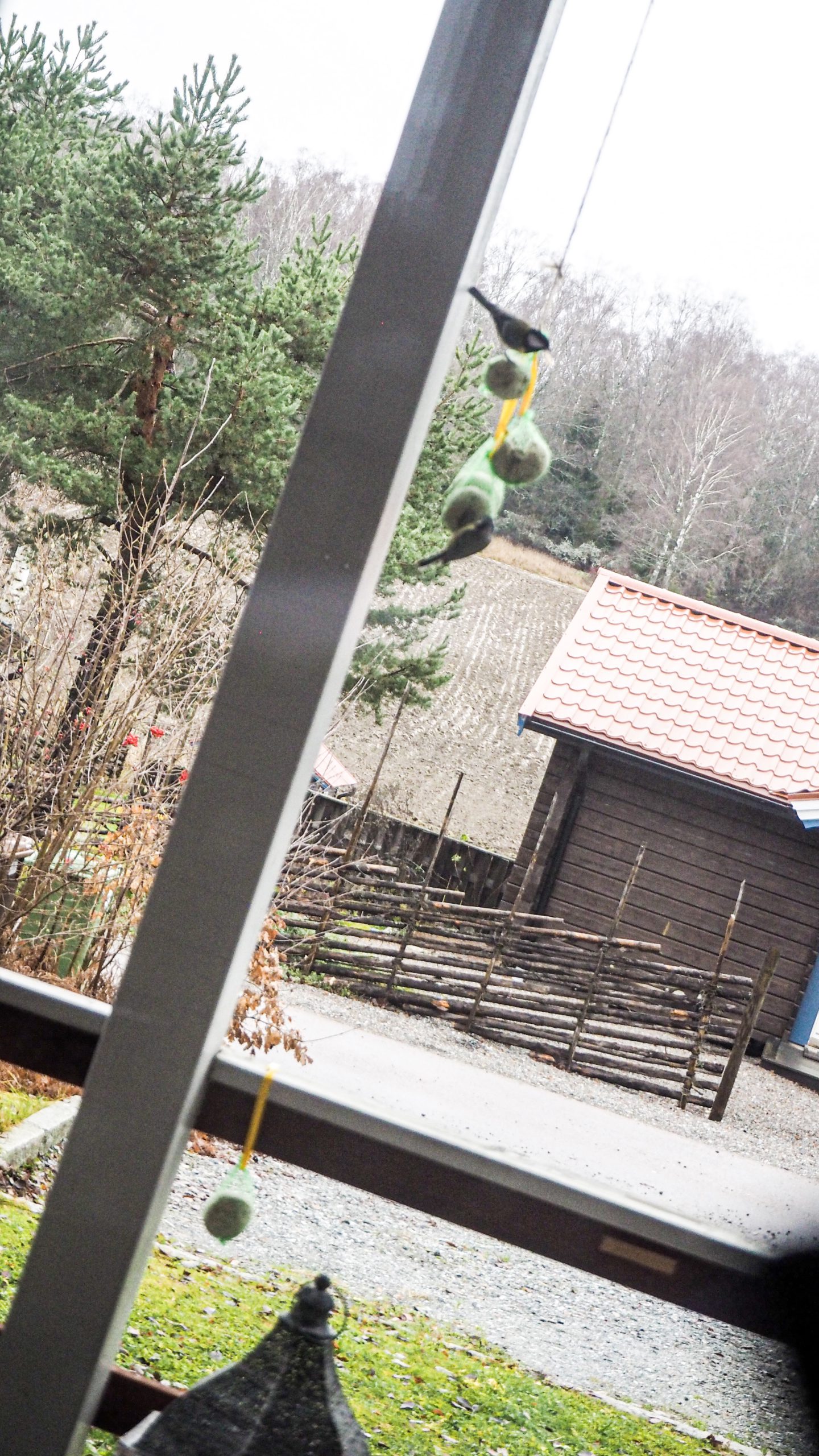 Har just varit ute på promenad och nu hängt upp lite mat till småfåglarna. Det blev en himla fart runt maten. Samtidigt så har Majlis något att titta på.