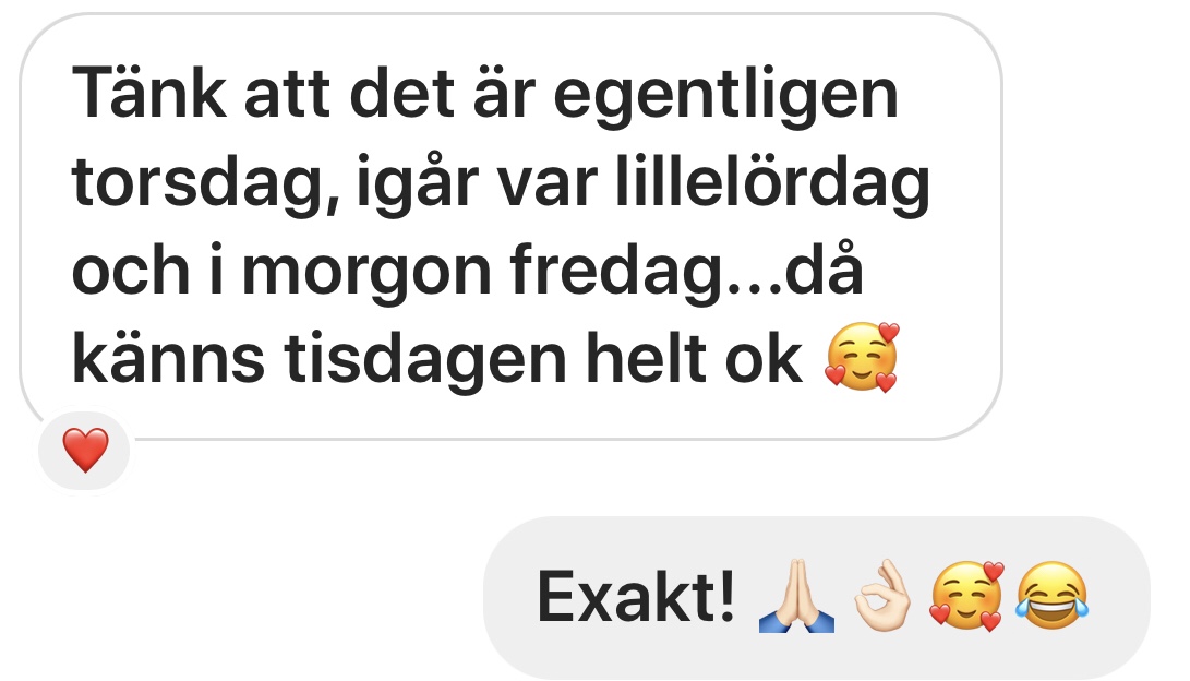 Haha, ja såna här härliga kommentarer kan man få på Instastory. Idag kan man säga att det är torsdag ju….. tänk, vi slapp trista Tisdag helt och hållet. Skönt!