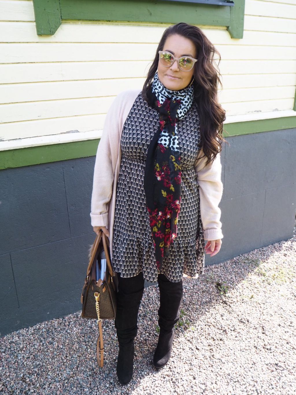 Ja så fick det lov att bli. Hörde när de diskuterade det här med trender och hur man ska klä sig….. Man ska klä sig som man känner för det. Ämen hur bra? >>Scarfen<< passade inte så jättebra till just detta men det var den jag hann ta i farten. Skulle hunnit byta till svarta väskan också – men när jag tittade i den så fick jag en chock. Visar jag er detta så förstår ni nivån på min handväskas innehåll kanske?