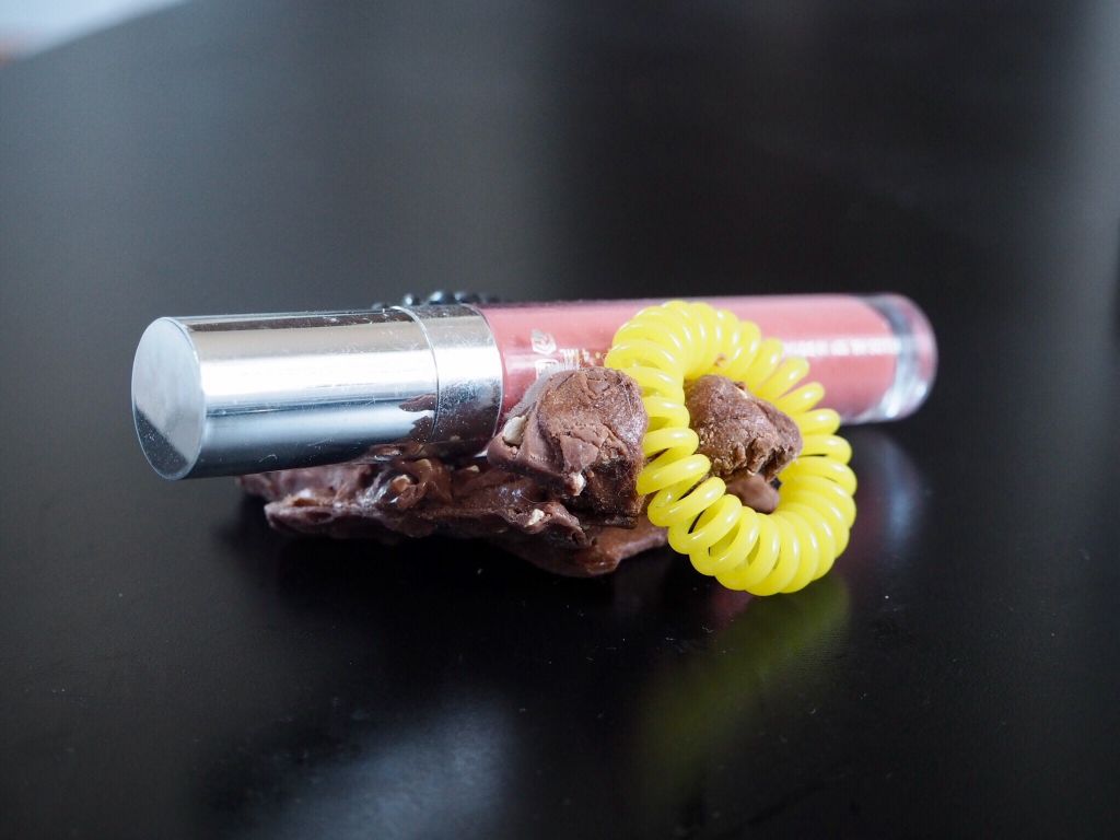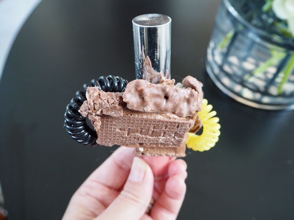 Aaaaaaaahahahahahahahaaaaa!!!! Ämen hajar ni? Så vidrigt!!! 🙂 Det är en jäkla chokladkaka som åkt ur en förpackning. Sen har läppglans och två plasttofsar fastnat i den. Ämen jag döööööör. Tony höll på att svimma. Den väskan kräver en riktig genomkörare nu kan jag säga.