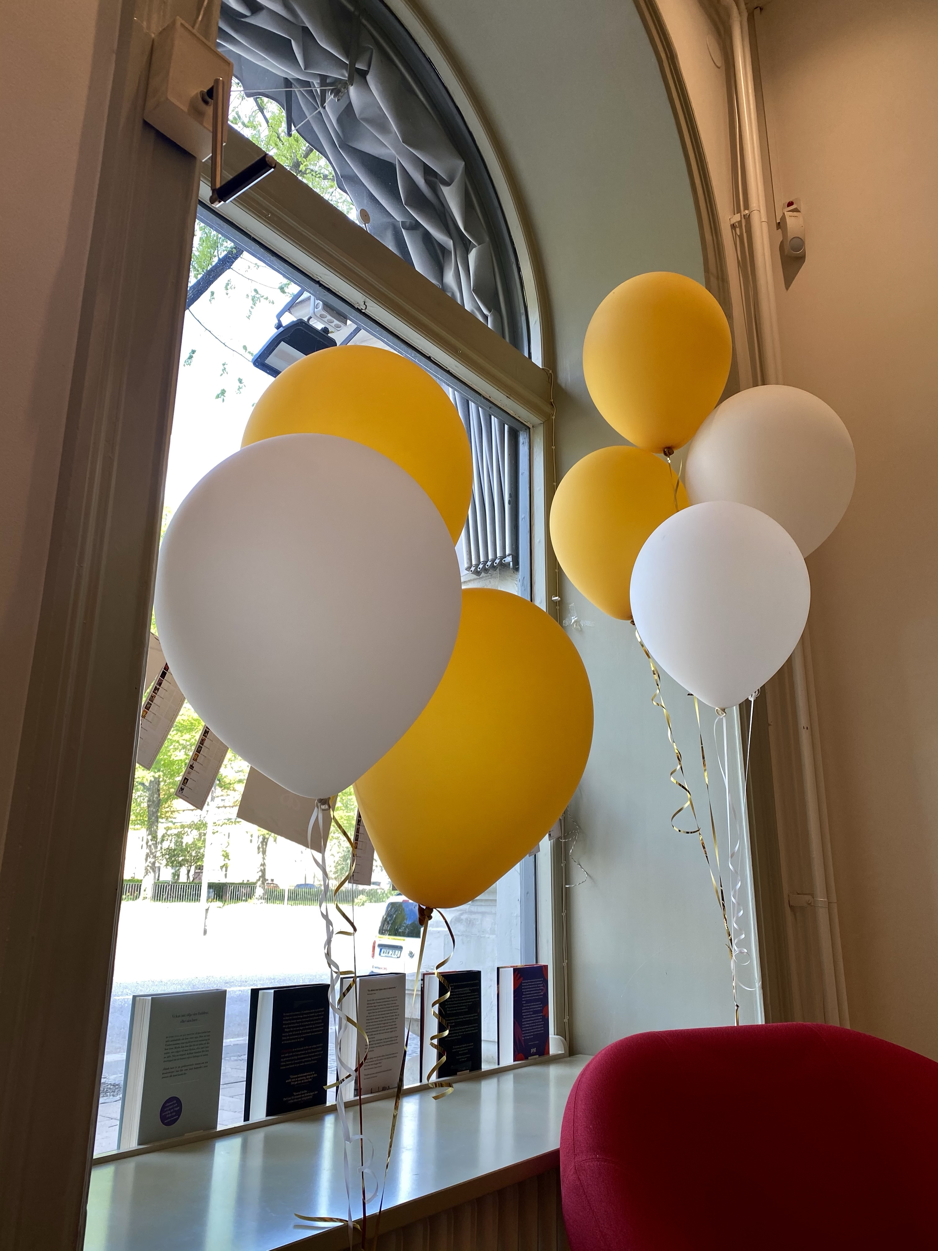 Här hade jag precis klivit innanför dörrarna på Bonnier efter att ha ”fastnat” i slussen emellan. Jag kan ju aldrig sköta mig och vara normal. Haha…. trodde en stund att ballongerna var till mig. Haha, närå! En så framstående författare är jag ju inte. 🤣