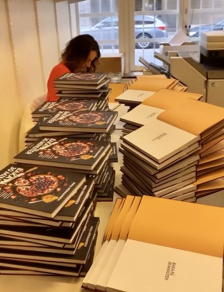 2 tjejer jobbade tillsammans med mig. En av dem vek upp boken och radade upp dem till mig. Enkelt att bara plocka ned och skriva signatur då. En av dem packade dem i kartonger sen. Vi hade såååå kul. Haha…man kan verkligen klicka med folk ibland. På ett sådär naturligt och härligt sätt.