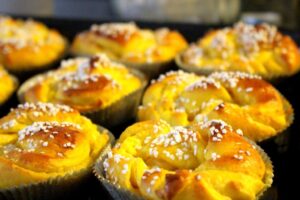 8) Lägg rullarna pappersformar på en bakplåt. Jäs under bakduk i cirka 30 minuter. Vispa upp ägg till penslingen. Pensla bullarna, strö över pärlsocker och grädda i 8-10 minuter. Ät & njut!