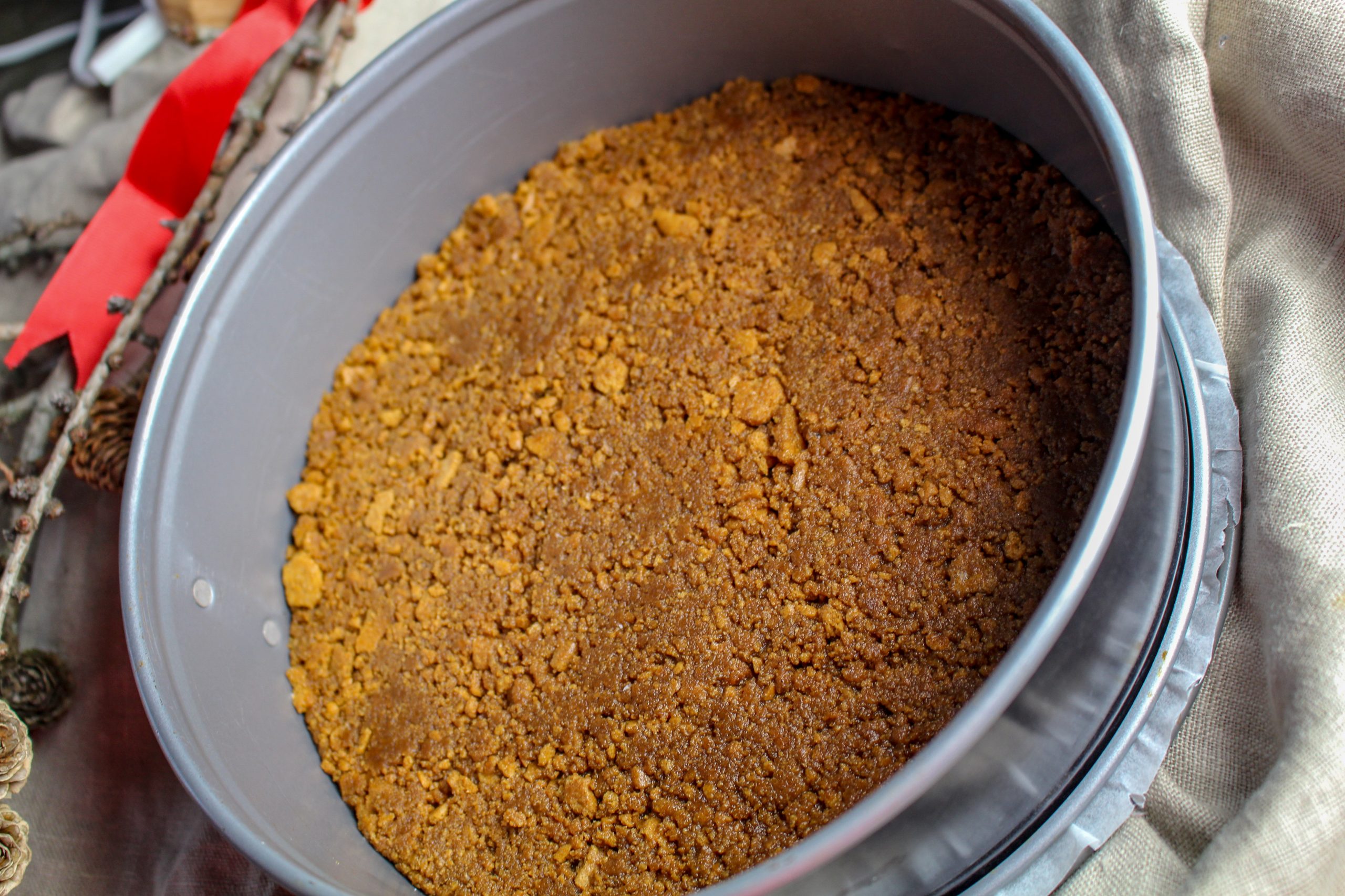 2) Blanda ut pepparkakorna med smält smör. Tryck ut i en bakplåtpapperklädd springform (botten ska vara klädd). Ställ i kylen i 10-15 min.