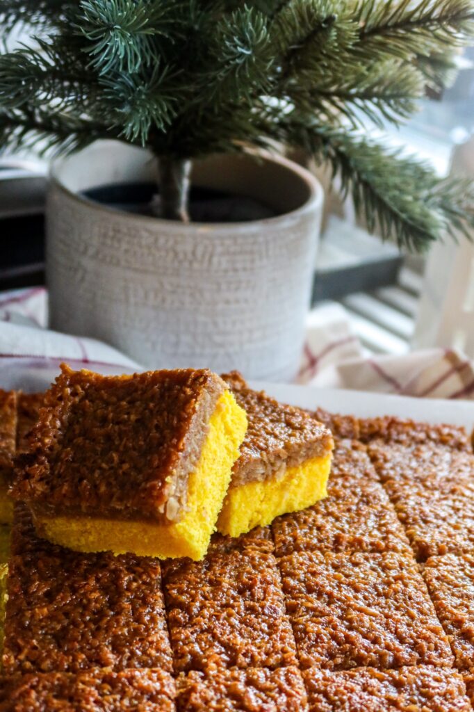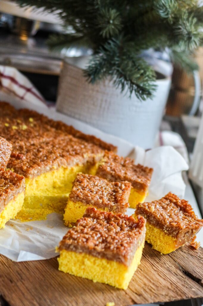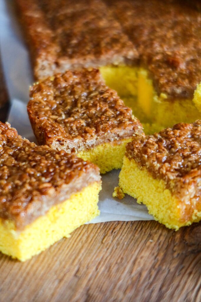 7. När kakan är klar och uttagen från ugnen, bred på glasyren och grädda ytterligare 10 minuter i ugnen tills kakan fått fin gyllenbrun färg. När kakan svalnat, skär kakan i fyrkanter.
