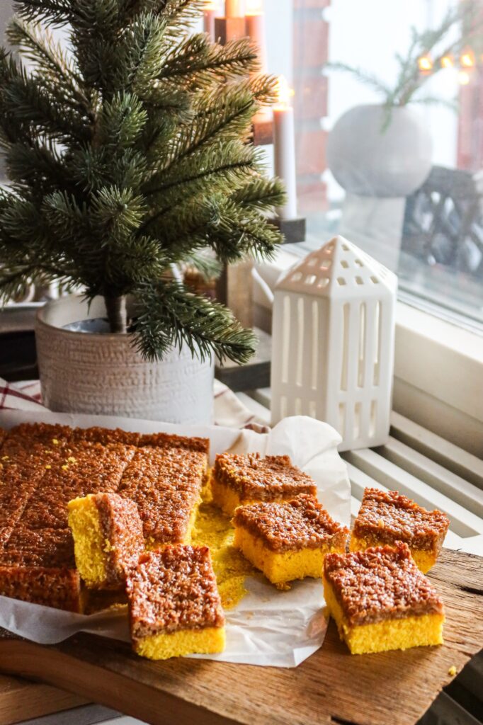 3. Blanda sist i det smälta smöret och saffranet och rör till en jämn smet. Bred ut kakan i långpannan med bakplåtspapper. Min långpanna är ca 35×27 cm.