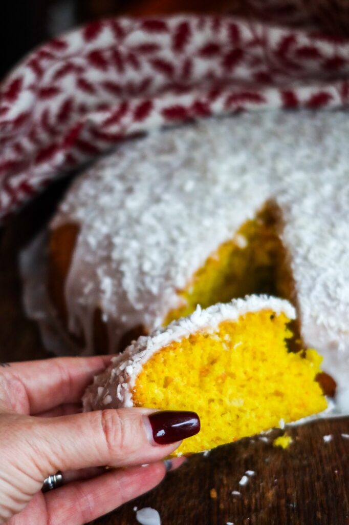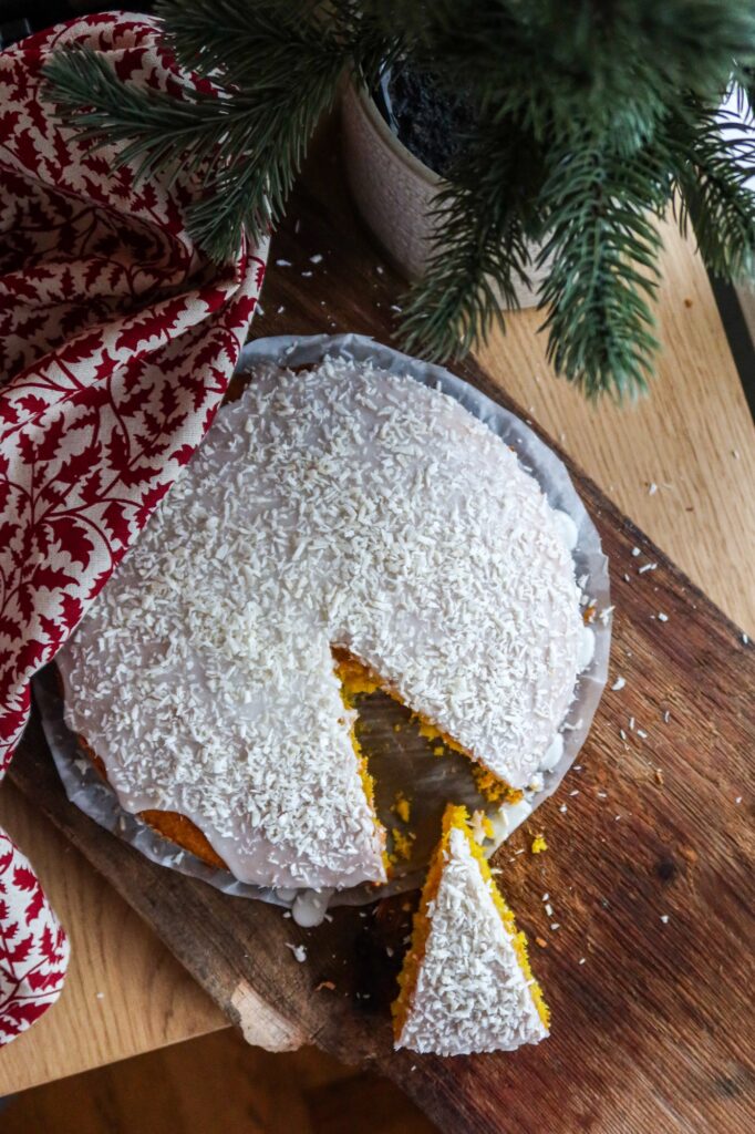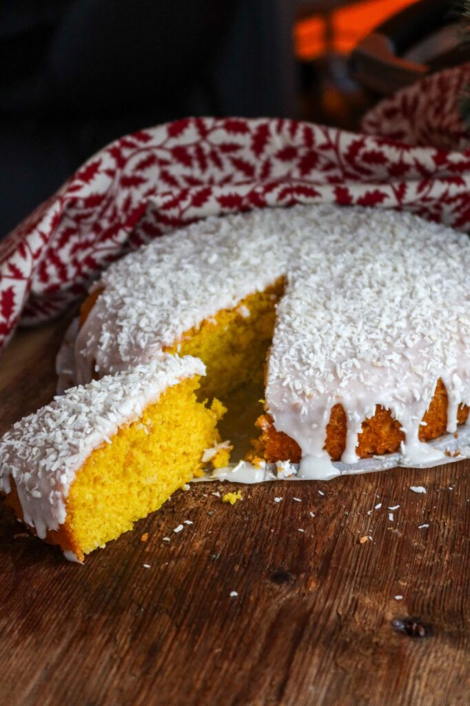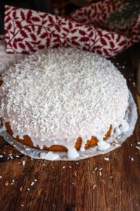 - När kakan har svalnat, bred på glasyren över kakan strö på kokosflingor och låt den stelna lite innan du serverar.