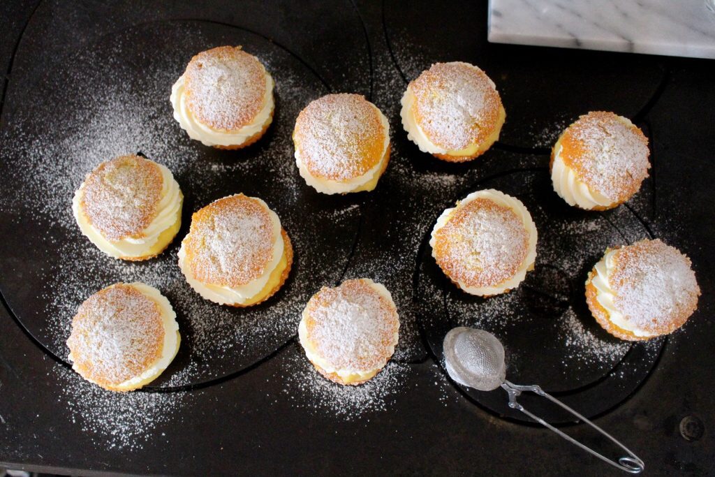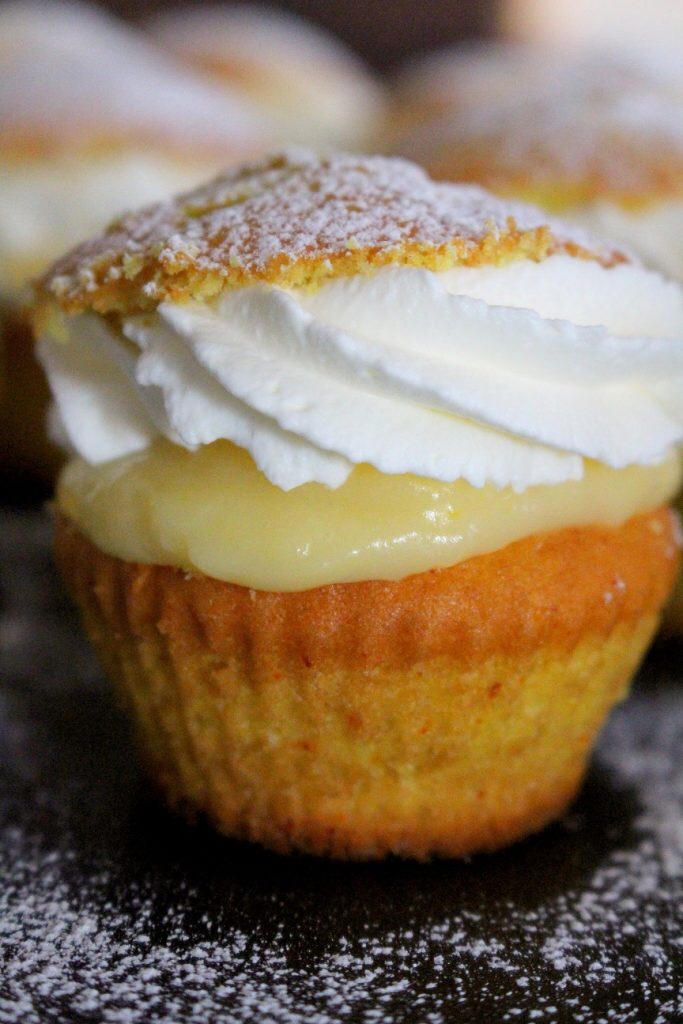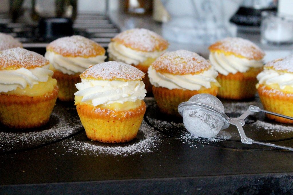 6) Låt muffinsen svalna helt. Skär av toppen på muffinsen och fyll sedan med vaniljkräm och vispad grädde. ÄT OCH NJUT!